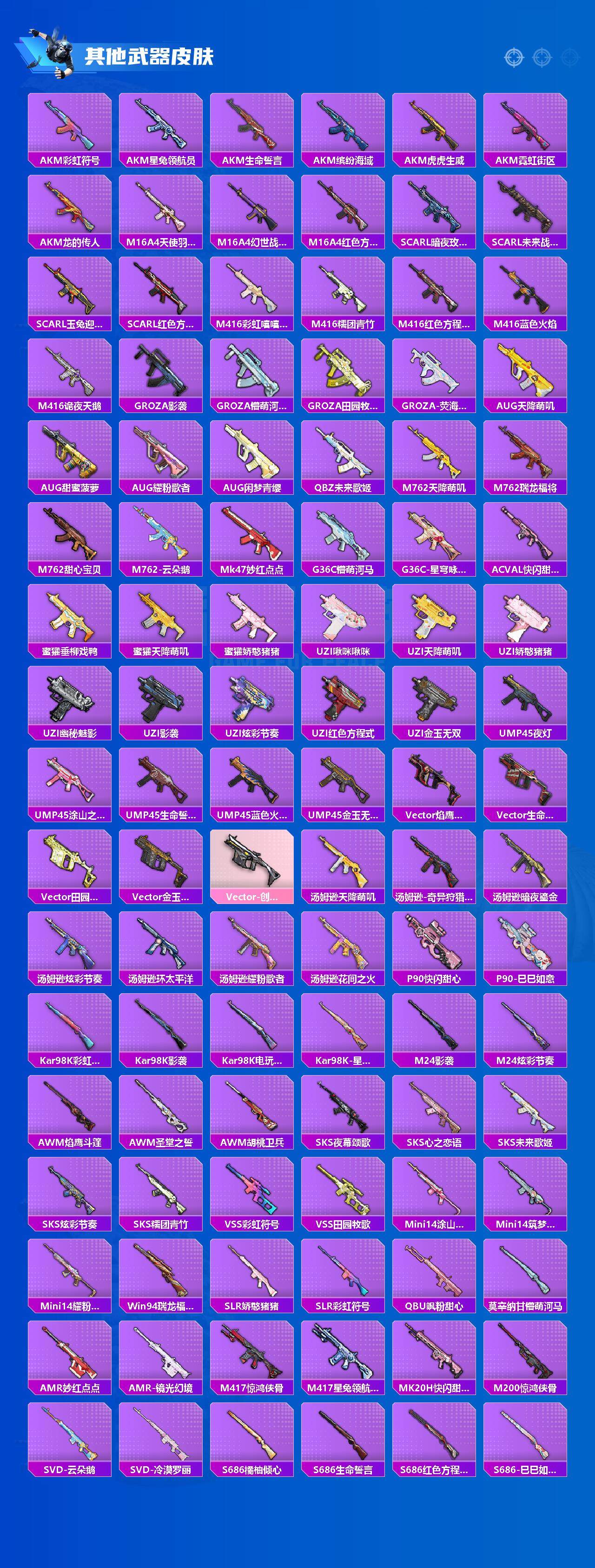 【稀有枪皮】:AKM-彩虹符号,AKM-星兔领航员,AKM-生命誓言,AKM-缤纷海域,AKM-虎虎生威,AKM-霓虹街区,AKM-龙的传人,M16A4-天使羽翼,M
