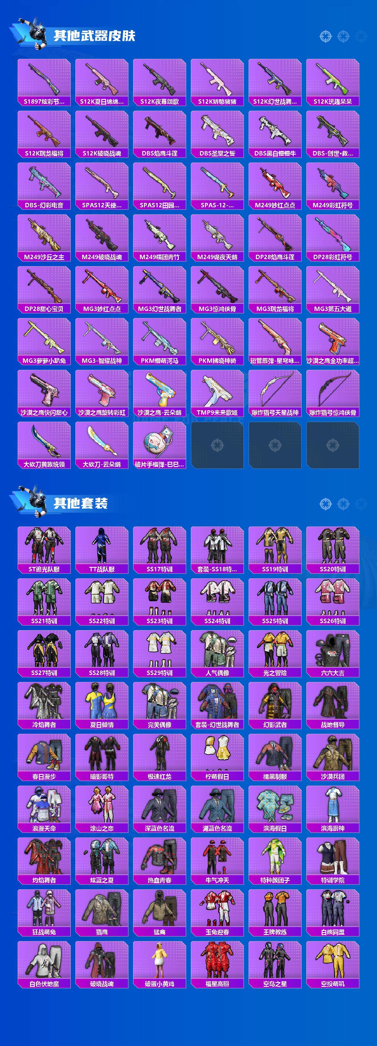 - [11682698]7粉装 6特效枪 1载具 6印记 可二次 身法装备:暗影哥特(红眼罩) 优质装备:玛莎拉蒂Ghibli(蓝),M416五爪金龙,极致幻想,新星烈龙(小白龙),潮汐统领,M762甜心娃娃,GROZA焦糖拿铁,SCAR-L青春物语,AWM橘柚倾心,AKM绿萝繁花 热门装扮:精灵娃娃,酣梦娃娃,复仇流浪者,宙之时溯,软萌银虎,大橘为重,仓鼠灰灰 五级特效枪:五级M416-五爪金龙,五级GROZA-焦糖拿铁 四级特效枪:四级AKM-绿萝繁花,四级M762-甜心娃娃 三级特效枪:三级SCAR-L-青春物语 二级特效枪:二级AWM-橘柚倾心 紫色装扮:SS22特训,SS21特训,SS31特训套装,SS5特训,冰原使者,,冰焰天使,凛冬战士,刚毅裁决者,北国孤狼,SS30特训套装,SS33特训套装,青涩时光,SS20特训,银白舞王,SS13特训,治愈之星,科技之星,SS14特训,飞驰魅影,音速流光,极速竞梦,SS19特训,浓情摩卡,魔力冰咖,焰山流火,月蓝流光,异彩先驱,SS18特训,酷萌兔限定,长空猛禽,雪山征服者,雪山精英,雪鹰学院,霓虹极客,霓虹街区,缤纷果语,蓝色守护者,跃动心情,飞行日记,龙腾端午,骑行爱好者,黄色名流,黎明保卫者,龙的传人,极速红龙,海滨突袭者,圣诞大吉,夏日音浪,完美偶像,帅气教官,幻世战舞者,战地菁英,疯狂小兔子,破蛋小黄鸡,神秘领域,甜蜜告白,空岛之星,竞技勇士朋克,牛气冲天,灰色格斗者,炫蓝之夏,燃烧卡路里,牛气满满,狂沙舞者,镭射皇者,SS29特训,星途旅人,SS28特训,玉兔迎春,竞技名士,暗影哥特(红眼罩),惊鸿侠骨,SS24特训(SS24特训套装),SS25特训,锦衣飞扬,浪漫天命,华灯初上,云霞荷露,SS26特训,精神漫游,炽焰拳师,格斗专家,SS6特训,圣殿骑士,银河圣歌,闪耀星光,黑色刀锋,核芯基因,SS7特训,拳皇97草薙京,淡雅花蕊,SS8特训,青龙圣者,原初圣火,逆风勇士,SS12特训,隐空刺,纯白誓言,SS9特训,暗夜契约,本愿之火,SS11特训,海洋之心,SS32特训服(SS32特训套装),金耀舞者,蓝调潮人,丛林猎人,传奇侦探 优质战备:万古烈焰降落伞,闲梦青缨降落伞,至尊龙雀降落伞,梦幻火箭飞行器,星之信仰降落伞,伏魔团降落伞,甜蜜誓约降落伞,锦绣火鲤降落伞,绚金瑰梦降落伞,天之羽翼降落伞