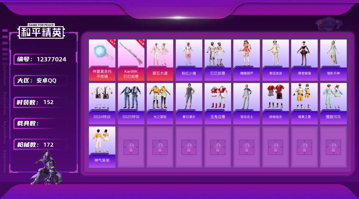 [12377024]【商品标题】:安卓 手Q-2粉装-3特效枪-0载具-0粉色飞行器-52994热力值-12王牌印记-152套装-172枪皮