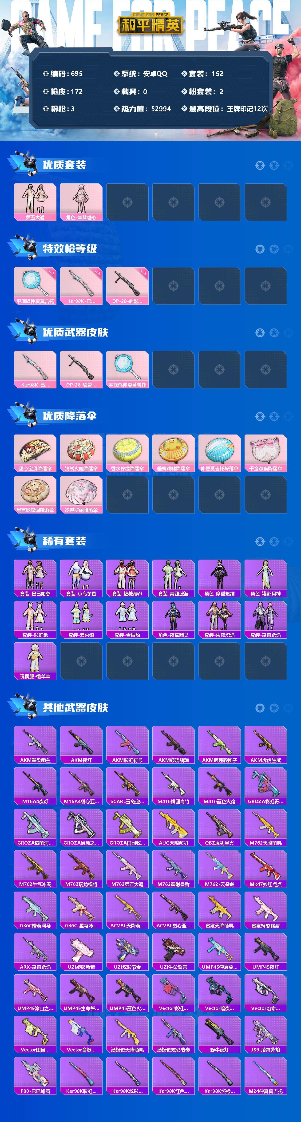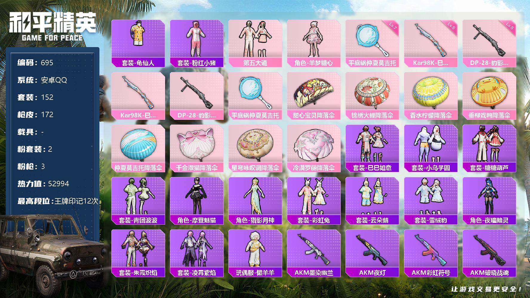 [12377024]【商品标题】:安卓 手Q-2粉装-3特效枪-0载具-0粉色飞行器-52994热力值-12王牌印记-152套装-172枪皮 【热门品类】:套装-龟仙人,套装-粉红小猪 【粉色套装】:粉装-第五大道,角色-羊梦糖心 【粉色枪皮等级】:Kar98K-巳巳如意(五级),DP-28-豹影疾电(五级),平底锅-仲夏莫吉托(七级) 【粉色枪皮】:Kar98K-巳巳如意,DP-28-豹影疾电,平底锅-仲夏莫吉托 【粉色降落伞】:甜心宝贝降落伞,锦绣火鲤降落伞,香水柠檬降落伞,垂柳戏鸭降落伞,仲夏莫吉托降落伞,千金淑猫降落伞,星穹咏叹调降落伞,冷漠罗丽降落伞 【稀有套装】:套装-龟仙人,套装-巳巳如意,套装-小鸟芋圆,套装-糖糖葫芦,套装-青团波波,角色-摩登魅猫,角色-猎影月神,套装-彩虹兔,套装-云朵鹅,套装-雪绒豹,角色-夜瞳黯灵,套装-朱霞炽焰,套装-凌霄紫焰,玩偶服-懒羊羊 【稀有枪皮】:AKM-墨染幽兰,AKM-夜灯,AKM-彩虹符号,AKM-破晓战魂,AKM-萌趣颜团子,AKM-虎虎生威,M16A4-夜灯,M16A4-甜心亚梦,SCAR-L-玉兔迎春,M416-糯团青竹,M416-蓝色火焰,GROZA-彩虹符号,GROZA-懵萌河马,GROZA-治愈之星,GROZA-田园牧歌,AUG-天降萌叽,QBZ-原初圣火,M762-天降萌叽,M762-牛气冲天,M762-瑞龙福将,M762-第五大道,M762-镭射皇者,M762-云朵鹅,Mk47-妙红点点,G36C-懵萌河马,G36C-星穹咏叹调,AC-VAL-天降萌叽,AC-VAL-甜心亚梦,蜜獾-天降萌叽,蜜獾-娇憨猪猪,ARX-凌霄紫焰,UZI-娇憨猪猪,UZI-炫彩节奏,UZI-生命誓言,UMP45-仲夏莫吉托,UMP45-夜灯,UMP45-涂山之恋,UMP45-生命誓言,UMP45-蓝色火焰,Vector-彩虹符号,Vector-暗夜玫瑰,Vector-治愈之星,Vector-田园牧歌,Vector-音爆索尼克,汤姆逊-天降萌叽,汤姆逊-炫彩节奏,野牛-夜灯,JS9-凌霄紫焰,P90-巳巳如意,Kar98K-彩虹符号,Kar98K-炫彩节奏,Kar98K-红色方程式,Kar98K-终极赛罗,M24-治愈之星,M24-炫彩节奏,M24-仲夏莫吉托,SKS-糯团青竹,VSS-彩虹符号,VSS-田园牧歌,VSS-镭射皇者,