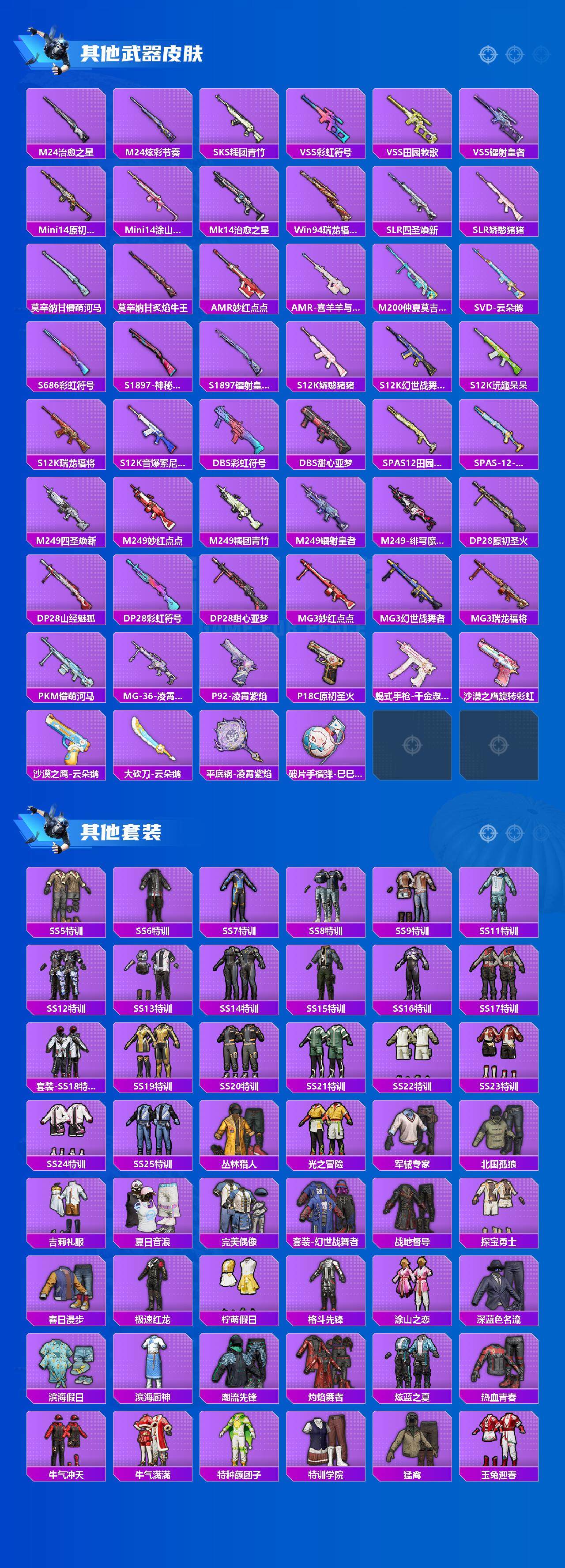 【稀有枪皮】:AKM-墨染幽兰,AKM-夜灯,AKM-彩虹符号,AKM-破晓战魂,AKM-萌趣颜团子,AKM-虎虎生威,M16A4-夜灯,M16A4-甜心亚梦,SCAR-L-玉兔迎春,M416-糯团青竹,M416-蓝色火焰,GROZA-彩虹符号,GROZA-懵萌河马,GROZA-治愈之星,GROZA-田园牧歌,AUG-天降萌叽,QBZ-原初圣火,M762-天降萌叽,M762-牛气冲天,M762-瑞龙福将,M762-第五大道,M762-镭射皇者,M762-云朵鹅,Mk47-妙红点点,G36C-懵萌河马,G36C-星穹咏叹调,AC-VAL-天降萌叽,AC-VAL-甜心亚梦,蜜獾-天降萌叽,蜜獾-娇憨猪猪,ARX-凌霄紫焰,UZI-娇憨猪猪,UZI-炫彩节奏,UZI-生命誓言,UMP45-仲夏莫吉托,UMP45-夜灯,UMP45-涂山之恋,UMP45-生命誓言,UMP45-蓝色火焰,Vector-彩虹符号,Vector-暗夜玫瑰,Vector-治愈之星,Vector-田园牧歌,Vector-音爆索尼克,汤姆逊-天降萌叽,汤姆逊-炫彩节奏,野牛-夜灯,JS9-凌霄紫焰,P90-巳巳如意,Kar98K-彩虹符号,Kar98K-炫彩节奏,Kar98K-红色方程式,Kar98K-终极赛罗,M24-治愈之星,M24-炫彩节奏,M24-仲夏莫吉托,SKS-糯团青竹,VSS-彩虹符号,VSS-田园牧歌,VSS-镭射皇者,