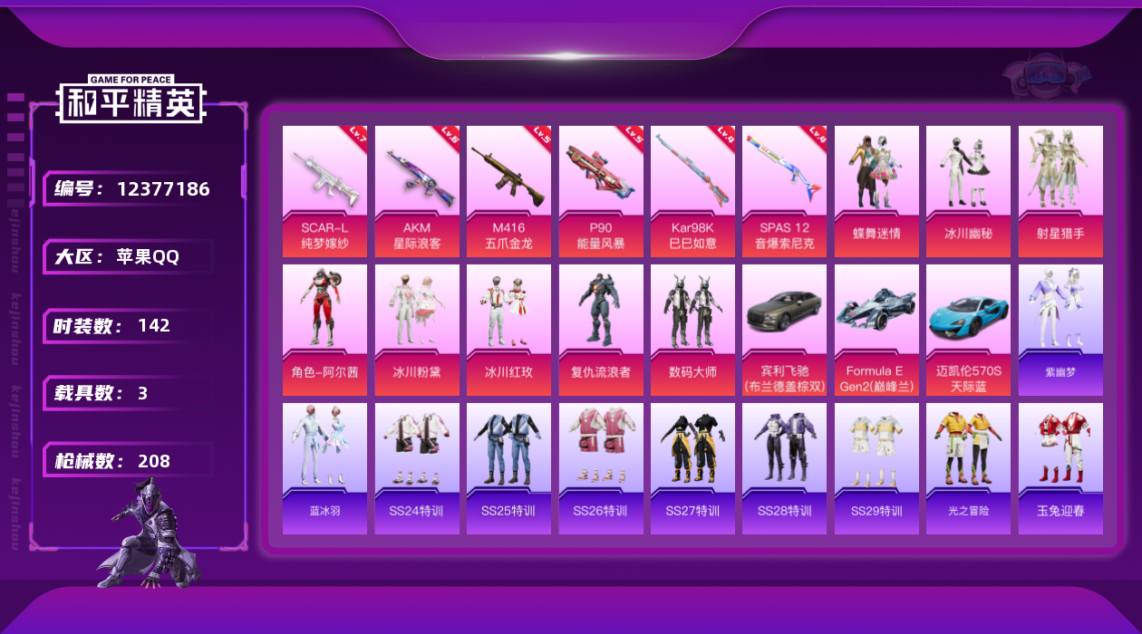[12377186]【商品标题】:苹果 手Q-10粉装-7特效枪-3载具-5粉色飞行器-69429热力值-10王牌印记-142套装-208枪皮