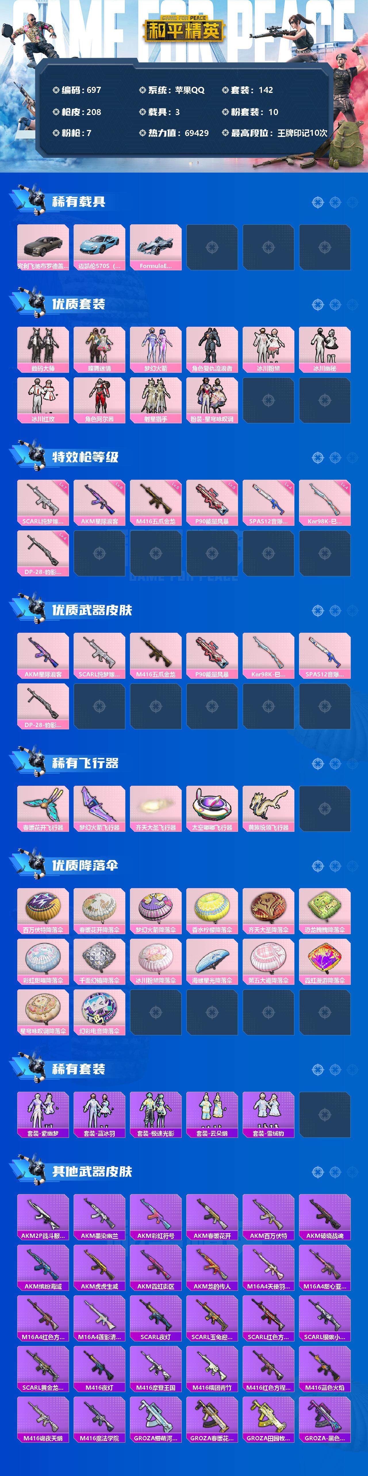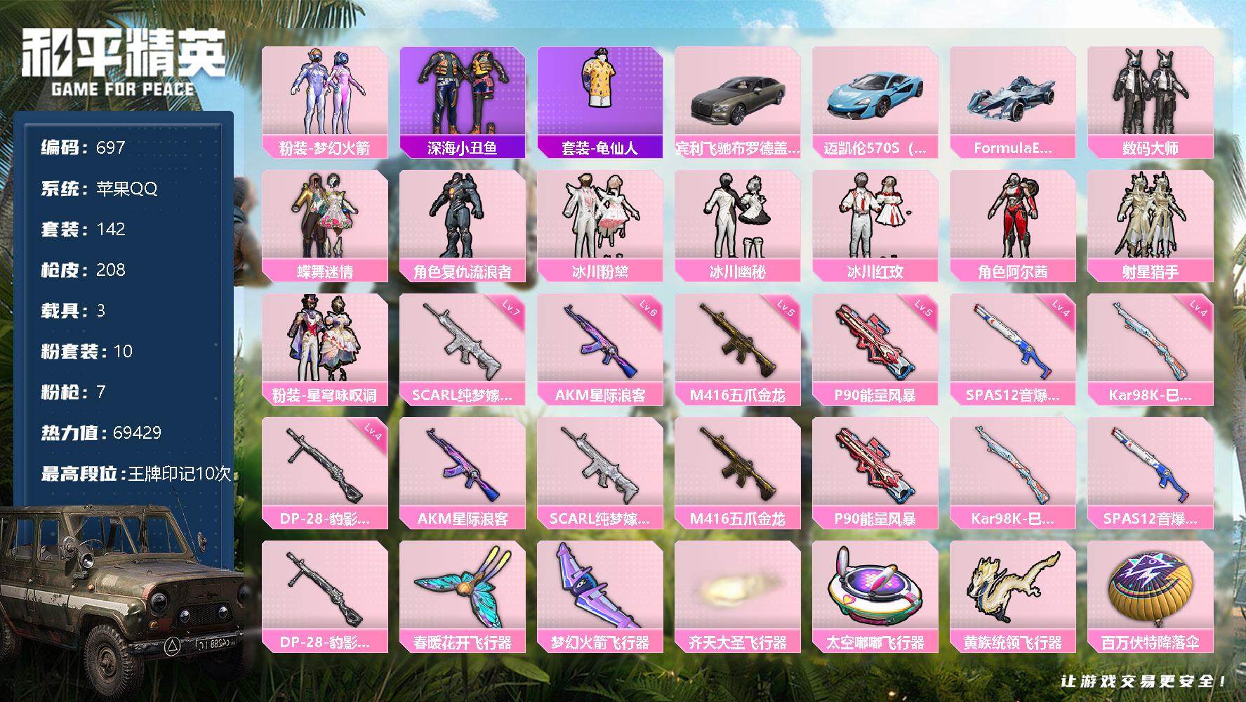 [12377186]【商品标题】:苹果 手Q-10粉装-7特效枪-3载具-5粉色飞行器-69429热力值-10王牌印记-142套装-208枪皮 【热门品类】:粉装-梦幻火箭,套装-深海小丑鱼,套装-龟仙人 【粉色载具】:宾利飞驰(布罗德盖棕双色),迈凯伦570S(天际蓝),Formula E Gen2(巅峰兰) 【粉色套装】:粉装-数码大师,粉装-蝶舞迷情,粉装-梦幻火箭,角色-复仇流浪者,粉装-冰川粉黛,粉装-冰川幽秘,粉装-冰川红玫,角色-阿尔茜,粉装-射星猎手,粉装-星穹咏叹调 【粉色枪皮等级】:AKM-星际浪客(六级),SCAR-L-纯梦嫁纱(七级),M416-五爪金龙(五级),P90-能量风暴(五级),Kar98K-巳巳如意(四级),SPAS-12-音爆索尼克(四级),DP-28-豹影疾电(四级) 【粉色枪皮】:AKM-星际浪客,SCAR-L-纯梦嫁纱,M416-五爪金龙,P90-能量风暴,Kar98K-巳巳如意,SPAS-12-音爆索尼克,DP-28-豹影疾电 【粉色飞行器】:春暖花开飞行器,梦幻火箭飞行器,齐天大圣飞行器,太空嘟嘟飞行器,黄族统领飞行器 【粉色降落伞】:百万伏特降落伞,春暖花开降落伞,梦幻火箭降落伞,香水柠檬降落伞,齐天大圣降落伞,恐龙拽拽降落伞,彩虹甜喵降落伞,千面幻镜降落伞,冰川粉黛降落伞,海螺星光降落伞,第五大道降落伞,霓虹漫游降落伞,星穹咏叹调降落伞,幻彩电音降落伞 【稀有套装】:套装-龟仙人,套装-紫幽梦,套装-蓝冰羽,套装-极速光影,套装-云朵鹅,套装-雪绒豹 【稀有枪皮】:AKM-2P战斗服款,AKM-墨染幽兰,AKM-彩虹符号,AKM-春暖花开,AKM-百万伏特,AKM-破晓战魂,AKM-缤纷海域,AKM-虎虎生威,AKM-霓虹街区,AKM-龙的传人,M16A4-天使羽翼,M16A4-甜心亚梦,M16A4-红色方程式,M16A4-莲影清波,SCAR-L-夜灯,SCAR-L-玉兔迎春,SCAR-L-红色方程式,SCAR-L-银碳小老虎,SCAR-L-黄金龙骨,M416-夜灯,M416-摩登王国,M416-糯团青竹,M416-红色方程式,M416-蓝色火焰,M416-诡夜天鹅,M416-魔法学院,GROZA-懵萌河马,GROZA-春暖花开,GROZA-田园牧歌,GROZA-黑色刀锋,AUG-冰川粉黛,AUG-天降萌叽,AUG-耀粉歌者,AUG