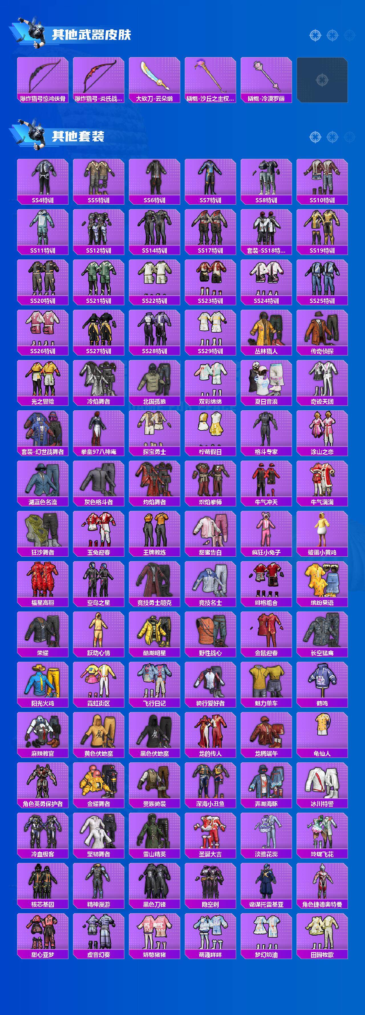 【稀有枪皮】:AKM-2P战斗服款,AKM-墨染幽兰,AKM-彩虹符号,AKM-春暖花开,AKM-百万伏特,AKM-破晓战魂,AKM-缤纷海域,AKM-虎虎生威,AKM-霓虹街区,AKM-龙的传人,M16A4-天使羽翼,M16A4-甜心亚梦,M16A4-红色方程式,M16A4-莲影清波,SCAR-L-夜灯,SCAR-L-玉兔迎春,SCAR-L-红色方程式,SCAR-L-银碳小老虎,SCAR-L-黄金龙骨,M416-夜灯,M416-摩登王国,M416-糯团青竹,M416-红色方程式,M416-蓝色火焰,M416-诡夜天鹅,M416-魔法学院,GROZA-懵萌河马,GROZA-春暖花开,GROZA-田园牧歌,GROZA-黑色刀锋,AUG-冰川粉黛,AUG-天降萌叽,AUG-耀粉歌者,AUG