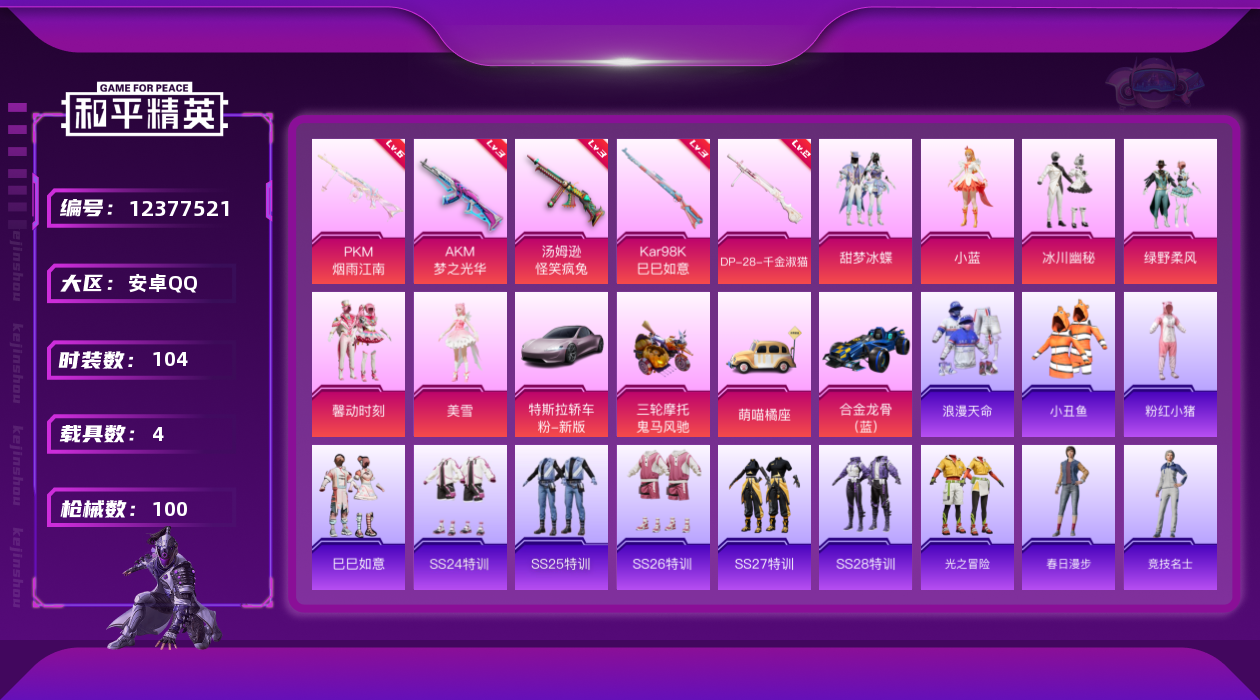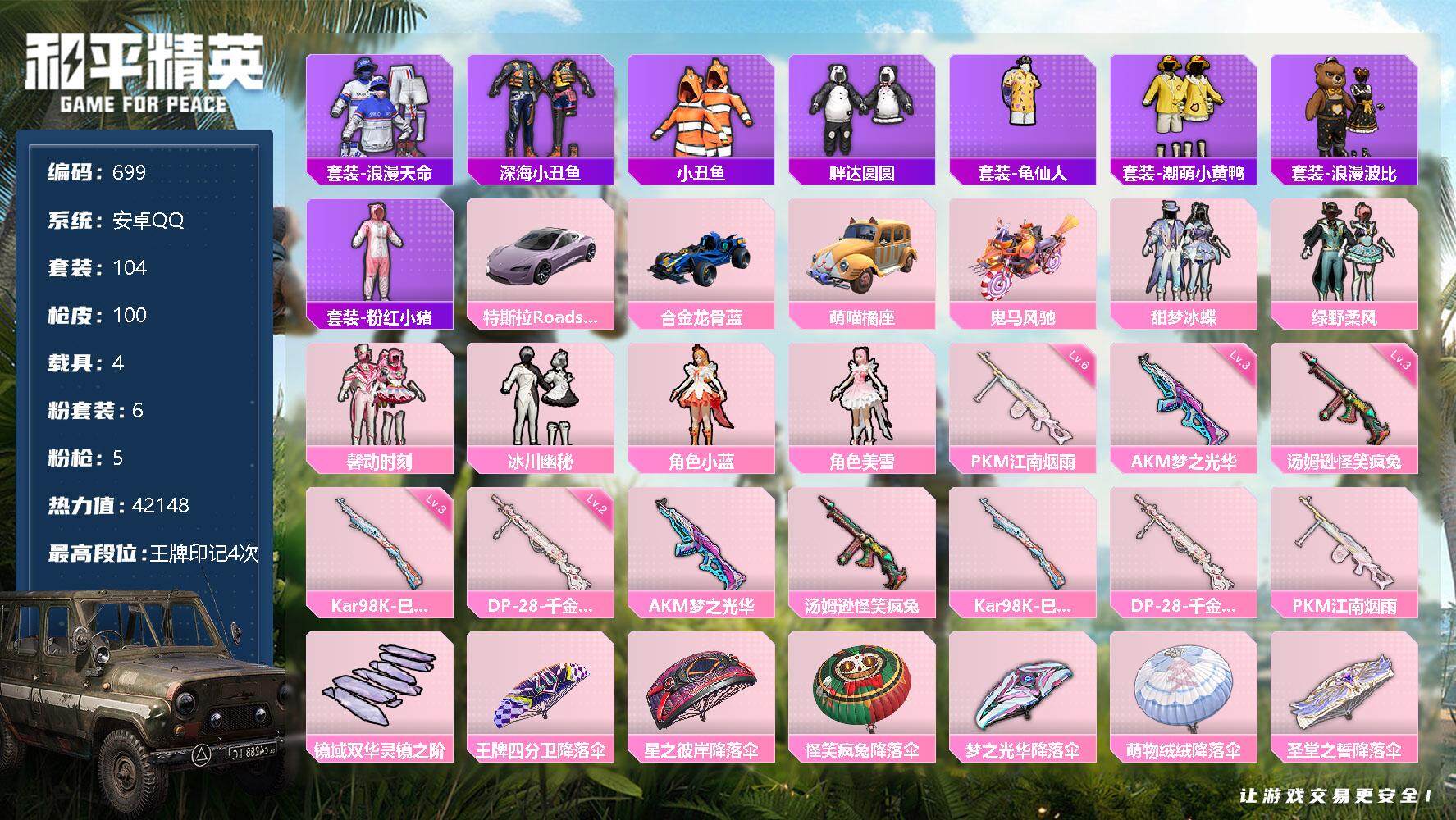 [12377521]【商品标题】:安卓 手Q-6粉装-5特效枪-4载具-1粉色飞行器-42148热力值-4王牌印记-104套装-100枪皮