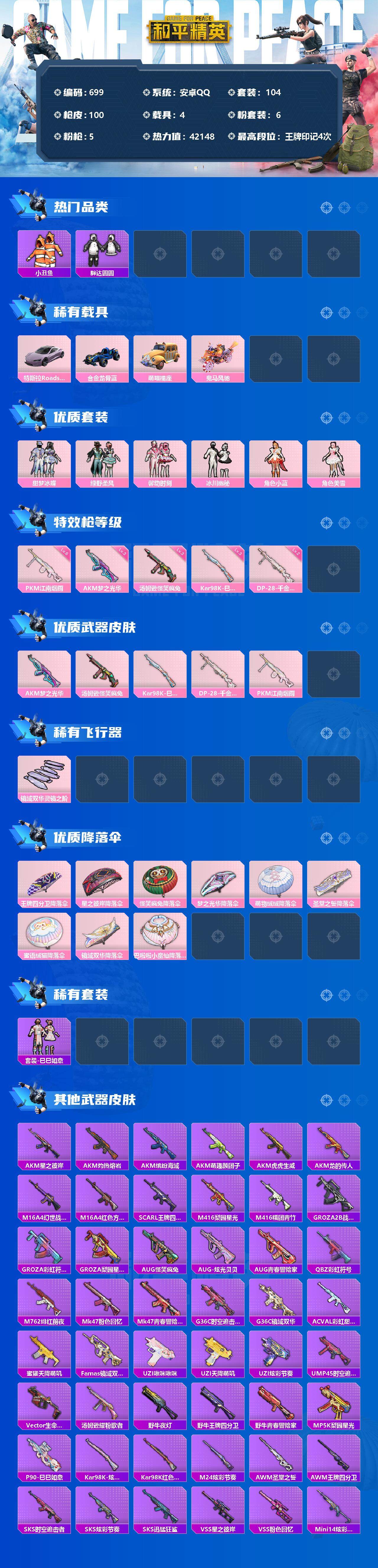[12377521]【商品标题】:安卓 手Q-6粉装-5特效枪-4载具-1粉色飞行器-42148热力值-4王牌印记-104套装-100枪皮 【热门品类】:套装-浪漫天命,套装-深海小丑鱼,套装-小丑鱼,套装-胖达圆圆,套装-龟仙人,套装-潮萌小黄鸭,套装-浪漫波比,套装-粉红小猪 【粉色载具】:特斯拉Roadster(沁心粉),合金龙骨(蓝),萌喵橘座,鬼马风驰 【粉色套装】:粉装-甜梦冰蝶,粉装-绿野柔风,粉装-馨动时刻,粉装-冰川幽秘,角色-小蓝,角色-美雪 【粉色枪皮等级】:AKM-梦之光华(三级),汤姆逊-怪笑疯兔(三级),Kar98K-巳巳如意(三级),DP-28-千金淑猫(二级),PKM-江南烟雨(六级) 【粉色枪皮】:AKM-梦之光华,汤姆逊-怪笑疯兔,Kar98K-巳巳如意,DP-28-千金淑猫,PKM-江南烟雨 【粉色飞行器】:镜域双华-灵镜之阶 【粉色降落伞】:王牌四分卫降落伞,星之彼岸降落伞,怪笑疯兔降落伞,梦之光华降落伞,萌物绒绒降落伞,圣堂之誓降落伞,蜜语绒猫降落伞,镜域双华降落伞,巴啦啦小魔仙降落伞 【稀有套装】:套装-龟仙人,套装-巳巳如意 【稀有枪皮】:AKM-星之彼岸,AKM-灼热熔岩,AKM-缤纷海域,AKM-萌趣颜团子,AKM-虎虎生威,AKM-龙的传人,M16A4-幻世战舞者,M16A4-红色方程式,SCAR-L-王牌四分卫,M416-梨园星光,M416-糯团青竹,GROZA-2B战斗服款,GROZA-彩虹符号,GROZA-梨园星光,AUG-怪笑疯兔,AUG-炫光贝贝,AUG-青春冒险家,QBZ-彩虹符号,M762-绯红前夜,Mk47-粉色回忆,Mk47-青春冒险家,G36C-镜域双华,G36C-时空追击者,AC-VAL-彩虹甜喵,蜜獾-天降萌叽,Famas-镜域双华,UZI-啾咪啾咪,UZI-天降萌叽,UZI-炫彩节奏,UMP45-时空追击者,Vector-生命誓言,汤姆逊-耀粉歌者,野牛-夜灯,野牛-王牌四分卫,野牛-青春冒险家,MP5K-梨园星光,P90-巳巳如意,Kar98K-炫光贝贝,Kar98K-红色方程式,M24-炫彩节奏,AWM-圣堂之誓,AWM-王牌四分卫,SKS-时空追击者,SKS-炫彩节奏,SKS-迅猛狂鲨,VSS-星之彼岸,VSS-粉色回忆,Mini14-炫彩节奏,Mini14-穿刺龙虾,Mini14-耀粉歌者,Mk14