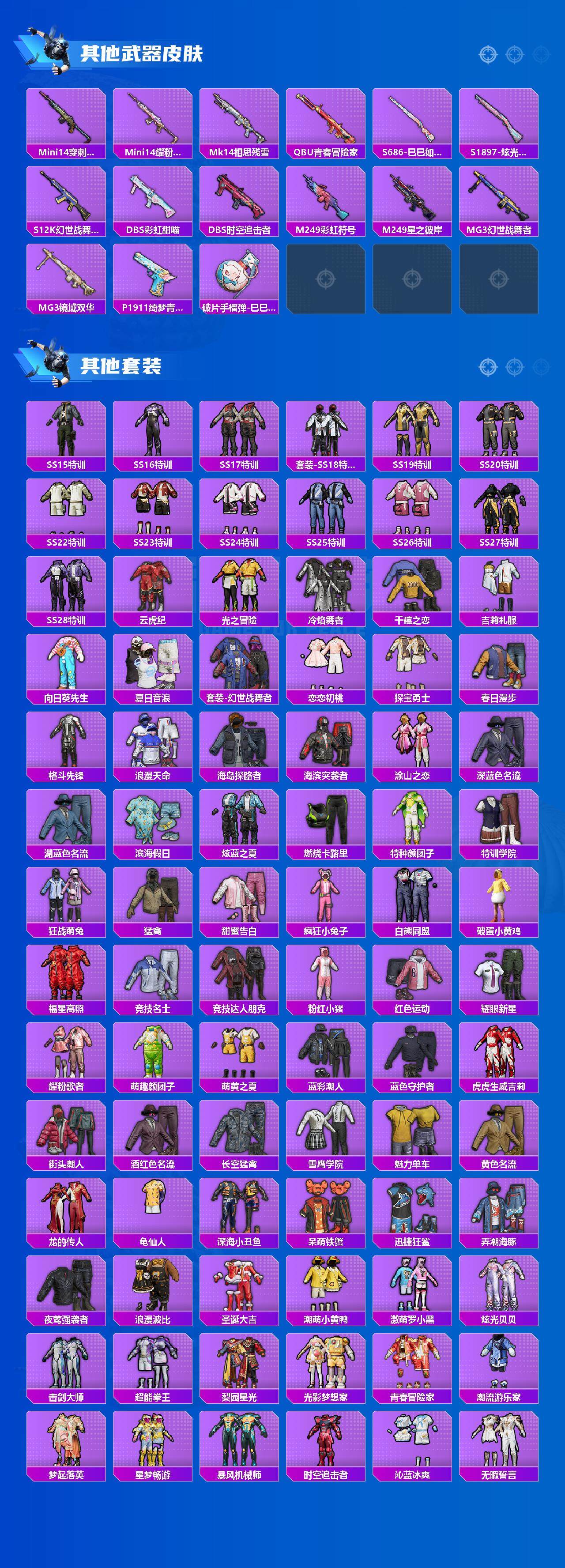 【稀有枪皮】:AKM-星之彼岸,AKM-灼热熔岩,AKM-缤纷海域,AKM-萌趣颜团子,AKM-虎虎生威,AKM-龙的传人,M16A4-幻世战舞者,M16A4-红色方程式,SCAR-L-王牌四分卫,M416-梨园星光,M416-糯团青竹,GROZA-2B战斗服款,GROZA-彩虹符号,GROZA-梨园星光,AUG-怪笑疯兔,AUG-炫光贝贝,AUG-青春冒险家,QBZ-彩虹符号,M762-绯红前夜,Mk47-粉色回忆,Mk47-青春冒险家,G36C-镜域双华,G36C-时空追击者,AC-VAL-彩虹甜喵,蜜獾-天降萌叽,Famas-镜域双华,UZI-啾咪啾咪,UZI-天降萌叽,UZI-炫彩节奏,UMP45-时空追击者,Vector-生命誓言,汤姆逊-耀粉歌者,野牛-夜灯,野牛-王牌四分卫,野牛-青春冒险家,MP5K-梨园星光,P90-巳巳如意,Kar98K-炫光贝贝,Kar98K-红色方程式,M24-炫彩节奏,AWM-圣堂之誓,AWM-王牌四分卫,SKS-时空追击者,SKS-炫彩节奏,SKS-迅猛狂鲨,VSS-星之彼岸,VSS-粉色回忆,Mini14-炫彩节奏,Mini14-穿刺龙虾,Mini14-耀粉歌者,Mk14