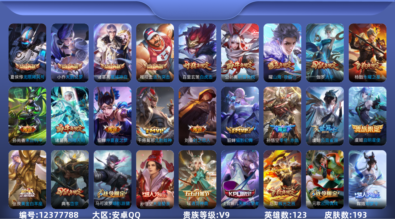[12377788]【商品标题】:安卓Q-V6-最强王者段位-123英雄-193皮肤-4典藏-0珍品无双-0无双-0珍品传说-15传说-65史诗