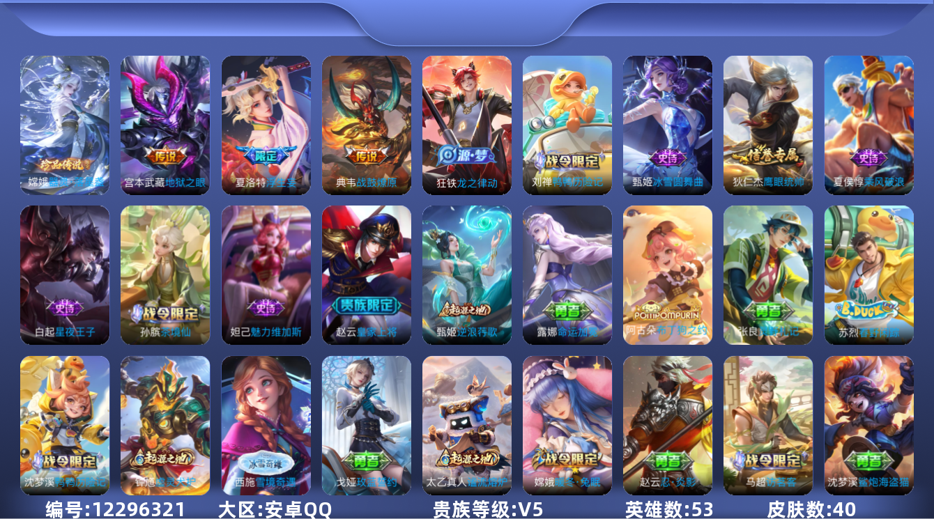 - [11608793]V10 4典藏 1珍品传说 43传说 125英雄 424皮肤 可修改实名 优质装备:鸣剑·曳影,全息碎影(猴子典藏),星域神启(倪克斯贼亮),最初的交响(伽罗典藏),朽木白哉,黄金狮子座,黄金射手座,云鹰飞将(小将军),黄金白羊座,炽阳神光,一念神魔,云霓雀翎,末日机甲-孙尚香(绿蚂蚱),地狱火,仲夏夜之梦(大飞蛾),零号·赤焰,地狱之眼,音你心动-周瑜,胖达荣荣,李逍遥,时之恋人-刘备(电焊工),淬星耀世,超时空战士-狄仁杰,末日机甲-孙策,无双飞将,碎云,澜逐花归海,艾琳觅芳踪 传说皮:幻光神枪 珍宝阁皮:万物之道,蔷薇恋人,女武神 限定皮:鸣野蒿,至尊宝,白虎志(电光耗子),凤求凰(白切鸡),凤凰于飞,太华(伽罗年限),异界灵契(白毛香),傲雪梅枪,补天,寅虎·展翼(孙膑年限),前尘镜,绯月行,白鹤梁神女,白晶晶,时雨天司(水龙头),神威(电光马子),飞衡(韩信年限),高山流水,匿光决锋者,五谷丰年,青龙志(铠年限),冰锋战神,武圣,天狼运算者,游园惊梦,梁祝,御风骁将(吕布年限),龙胆,烈魂,天狼溯光者,奔雷神使(牛魔年限),祈雪灵祝(雪兔子),李小龙,逐梦之影,玄武志(苏烈年限),朱雀志(守约年限),永曜之星,辉光之辰,霸王别姬-项羽,默契交锋-兰陵王,默契交锋-花木兰,孙行者,一生所爱,大圣娶亲,冰霜恋舞曲,匿光追影者,女儿国国王,寅虎·御盾(廉颇年限),寅虎·瑞焰(虎皮蛋子),寅虎·心曲(虎婆),寅虎·赤拳(老虎年限),时之祈愿-云中君,百木心枪,玉兔公主,启示之音,深海之息(深海大菠萝),唐三藏,枫霜尽 史诗皮:赞萌露比,鸭鸭历险记-刘禅,狼魂孤将,灵蛊蚀心,龙之律动,石田雨龙,百相守梦-周瑜,幻珠鲛人,曹操夜都魔契,百相守梦-黄忠,织梦人,守夜人,紫霞仙子,苍穹之光,电玩小子(小书包),白龙吟,黄金分割率,特工魅影,千年之狐,永昼,魅语,蒙恬荣光圣徽,无限星赏官,冰冠公主,青蛇,偶像歌手,白蛇,晚萤,暗夜猫娘,龙骑士(小龙虾),末日机甲-吕布,猫狗日记-孙策,猫狗日记-大乔,时之恋人-孙尚香,乱世虎臣,节奏热浪,修罗,女仆咖啡,摇滚巨星,水果甜心,绅士熊喵,天才门将,星夜王子,心灵骇客,时之奇旅-安琪拉,功夫厨神,德古拉伯爵,暗隐猎兽者,幽灵船长,鬼剑武藏,暗渊魔法,心灵战警,乐园奇幻夜,舞动绿茵,地狱岩魂,纤云弄巧,繁星吟游(呼啦呼啦),拒霜