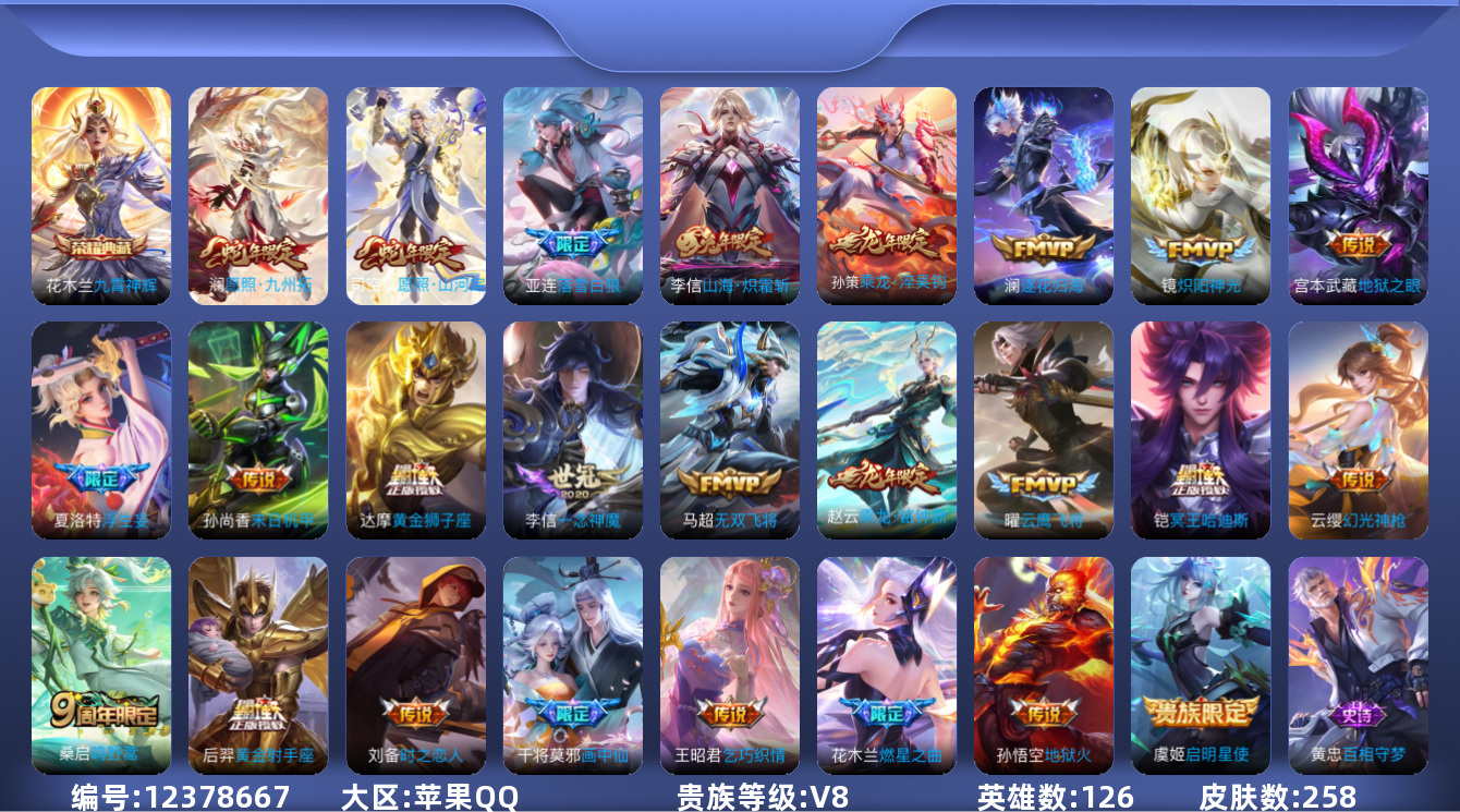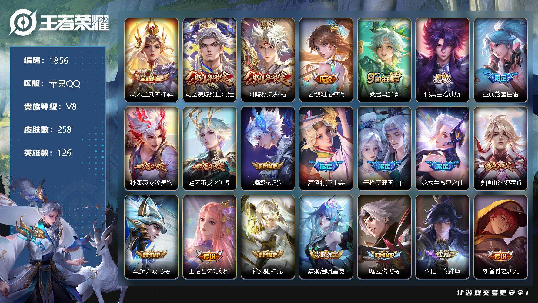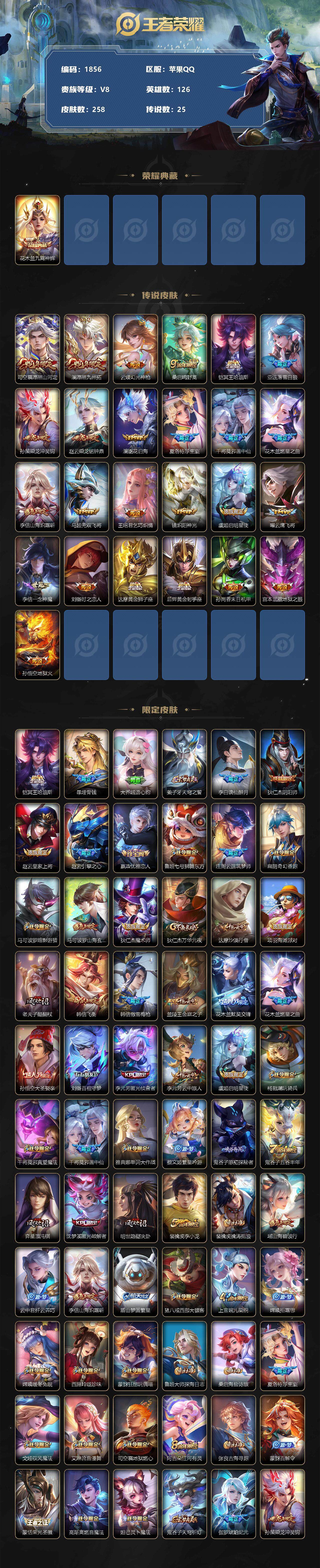 [12378667]【商品标题】:苹果Q-V8-至尊星耀III段位-126英雄-258皮肤-1典藏-0珍品无双-0无双-0珍品传说-25传说-90史诗