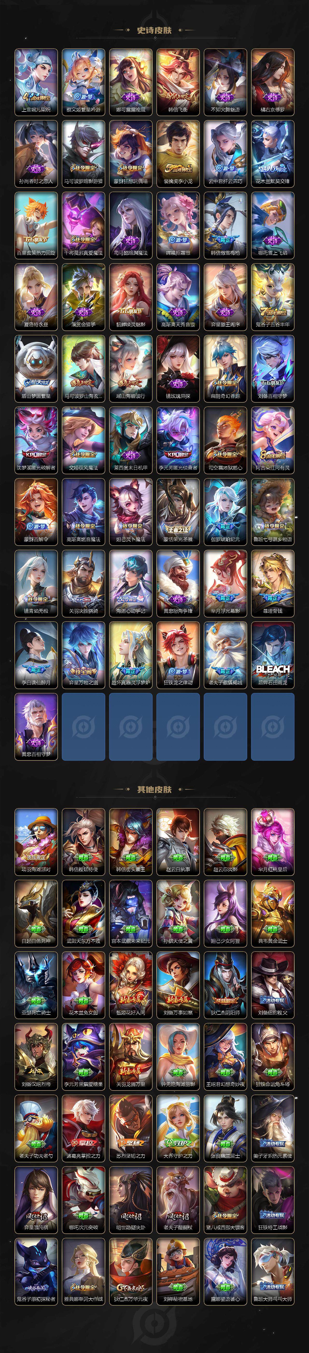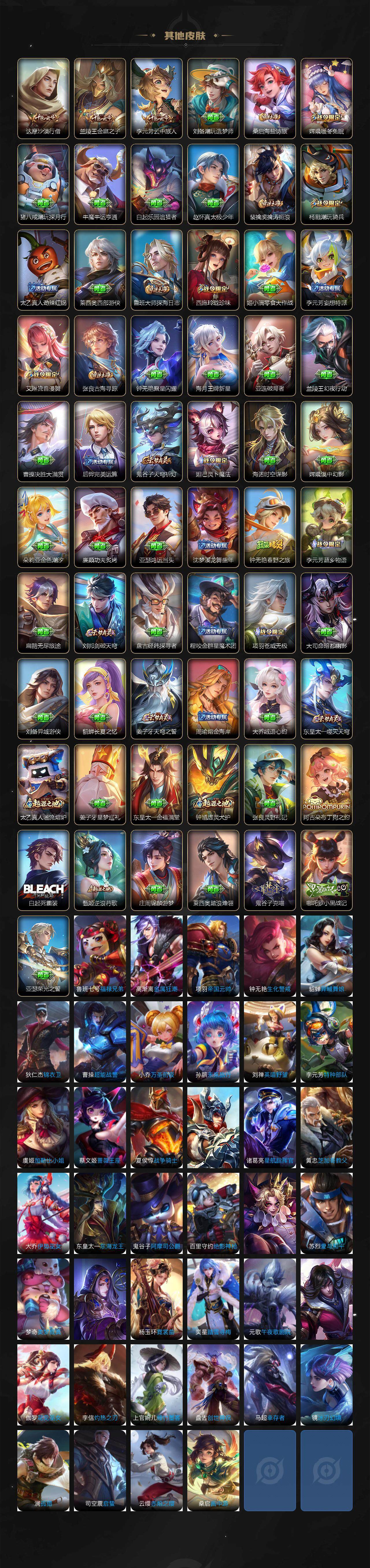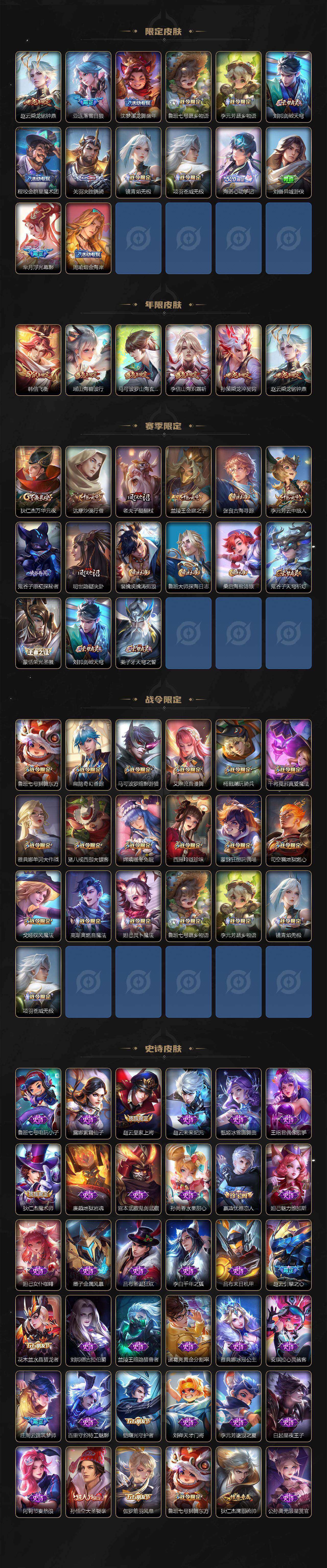 【限定皮肤】:铠冥王哈迪斯,暃埋骨钱,大乔绒语心约,姜子牙天穹之誓,李白谪仙醉月,狄仁杰阴阳师,赵云皇家上将,赵云引擎之心,嬴政优雅恋人,鲁班七号狮舞东方,庄周云端筑梦师,扁鹊奇幻香踪,马可波罗暗影游猎,马可波罗山海玄木吟,狄仁杰魔术师,狄仁杰万华元夜,达摩沙漠行僧,项羽海滩派对,老夫子醍醐杖,韩信飞衡,韩信傲雪梅枪,兰陵王金庭之子,花木兰默契交锋,花木兰燃星之曲,孙悟空大圣娶亲,刘备百相守梦,李元芳匿光侦查者,李元芳云中旅人,虞姬启明星使,杨戬潮玩骑兵,干将莫邪真爱魔法,干将莫邪画中仙,雅典娜单词大作战,蔡文姬繁星吟游,鬼谷子原初探秘者,鬼谷子五谷丰年,弈星混沌棋,沈梦溪匿光破解者,明世隐疑决卦,裴擒虎李小龙,裴擒虎擒涛扼浪,瑶山海碧波行,云中君纤云弄巧,李信山海炽霜斩,盾山梦圆繁星,猪八戒西部大镖客,上官婉儿梁祝,嫦娥拒霜思,嫦娥暖冬兔眠,西施玲珑珍味,蒙犽狂想玩偶喵,鲁班大师探海日志,桑启海盐诗旅,夏洛特浮生妄,戈娅驭风魔法,艾琳流音漫舞,司空震地狱燃心,阿古朵江河有灵,张良古海寻踪,蒙犽百解令,蒙恬荣光圣徽,高渐离燃音魔法,妲己灵卜魔法,鬼谷子天穹祈灯,伽罗琥珀纪元,孙策乘龙淬吴钩,赵云乘龙铭钟鼎,亚连落雪白狼,沈梦溪龙舞盛年,鲁班七号蔬乡物语,李元芳蔬乡物语,刘邦剑破天穹,程咬金群星魔术团,关羽决胜骁骑,镜青焰无极,项羽苍威无极,海诺心动手记,刘备异域游侠,芈月浮光幕影,周瑜熔金海岸