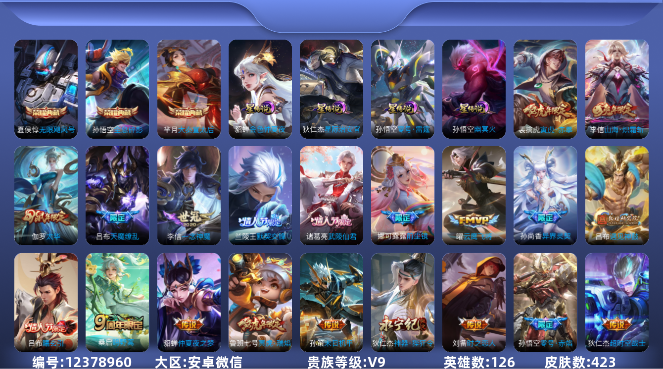 - [12277506]V7 1典藏 9传说 125英雄 272皮肤 可修改实名 优质装备:弑枪猎影(韩信典藏),黄金狮子座,黄金射手座,末日机甲-孙尚香(绿蚂蚱),零号·赤焰,超时空战士-狄仁杰,涂山容容 珍宝阁皮:妄想食味,蔷薇恋人 限定皮:愿照·岁时盈(虞姬年限),愿照·山河定(司空震年限),鸣野蒿,至尊宝,白晶晶,高山流水,五谷丰年,游园惊梦,梁祝,岱宗(典韦年限),李小龙,天魔缭乱,冰霜恋舞曲 史诗皮:鸭鸭历险记-刘禅,器灵·浮梦炉,狼魂孤将,星界战将,龙之律动,石田雨龙,怒海争锋,蔬乡物语(鲁班七号),百相守梦-百里守约,百相守梦-黄忠,苍穹之光,电玩小子(小书包),白龙吟,黄金分割率,特工魅影,永昼,末日机甲-莱西奥,魅语,高渐离燃音魔法,无限星赏官,偶像歌手,晚萤,猫狗日记-孙策,乱世虎臣,节奏热浪,女仆咖啡,摇滚巨星,水果甜心,绅士熊喵,星夜王子,心灵骇客,功夫厨神,德古拉伯爵,暗隐猎兽者,幽灵船长,鬼剑武藏,暗渊魔法,乐园奇幻夜,天秀·启明,地狱岩魂,纤云弄巧,繁星吟游(呼啦呼啦),拒霜思,缤纷独角兽,乘风破浪,逐浪之夏,水晶猎龙者,曙光守护者,箭羽风息,金属风暴,原初追逐者,圣诞狂欢,圣诞恋歌,鹰眼统帅,魅力维加斯,黎明之约,赏金猎手,奇遇舞章,未来纪元-赵云