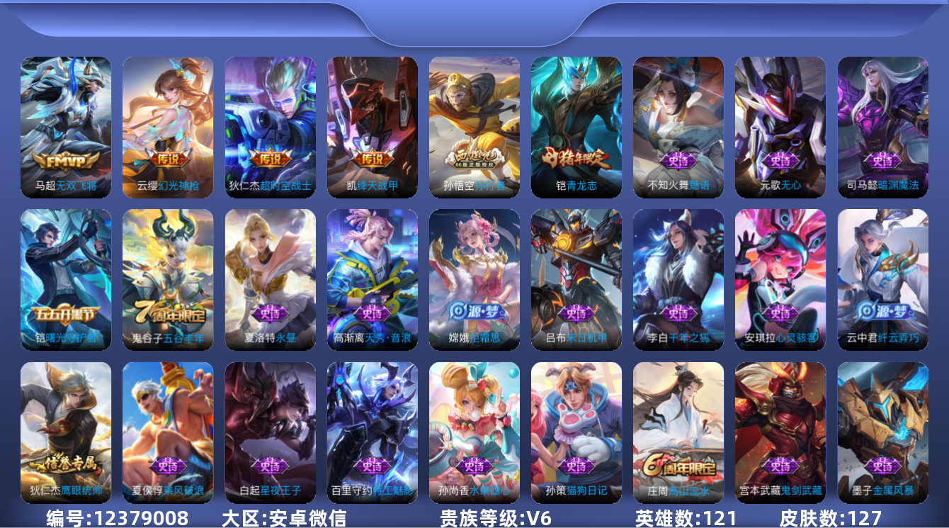 [12379008]AK297 【商品标题】:安卓WX-V6-永恒钻石I段位-121英雄-127皮肤-0典藏-0珍品无双-0无双-0珍品传说-4传说-27史诗