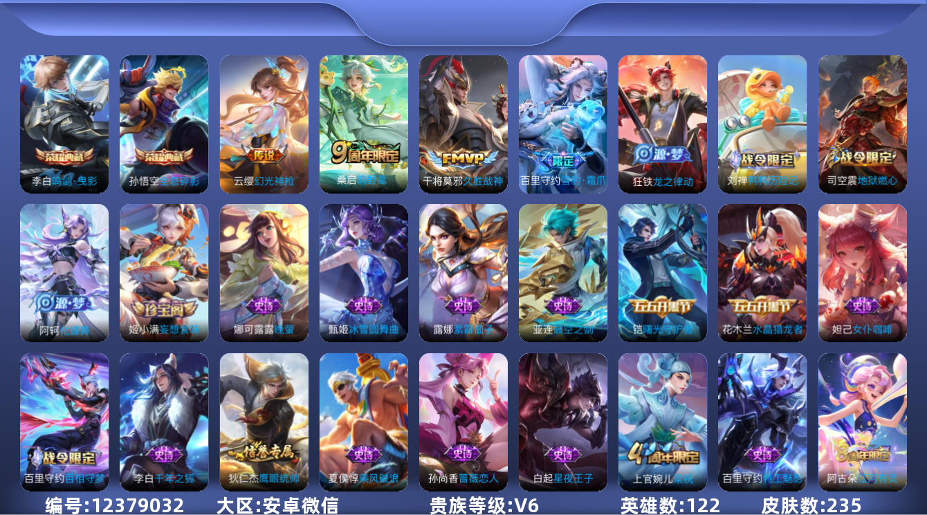 [12379032]【商品标题】:AK299-安卓WX-V6-最强王者段位-122英雄-235皮肤-2典藏-0珍品无双-0无双-0珍品传说-3传说-56史诗