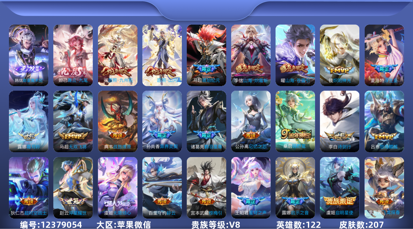 [12379054]【商品标题】:AK317-苹果WX-V8-永恒钻石II段位-122英雄-207皮肤-0典藏-0珍品无双-2无双-0珍品传说-26传说-54史诗