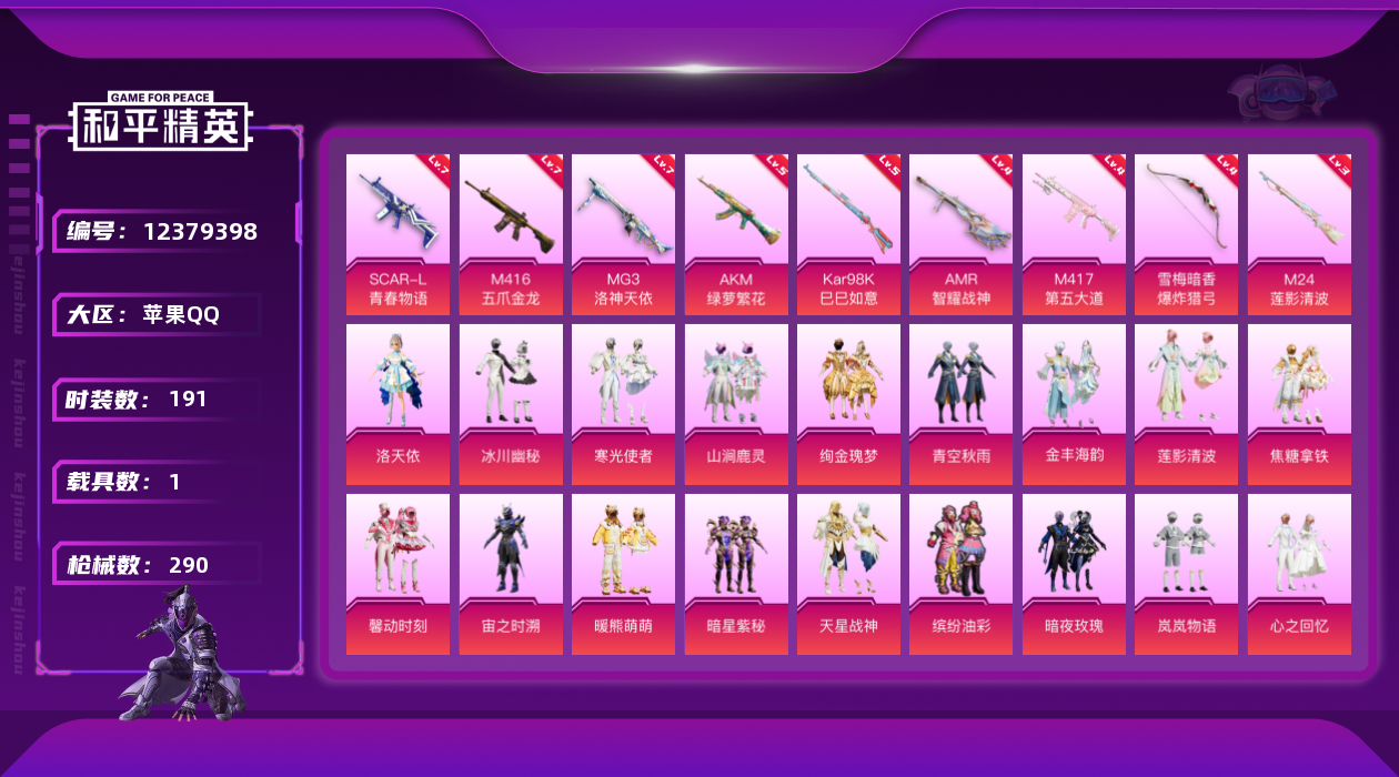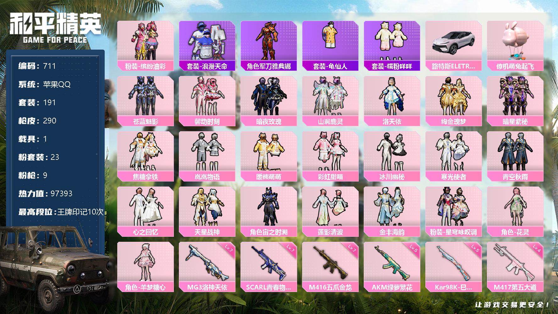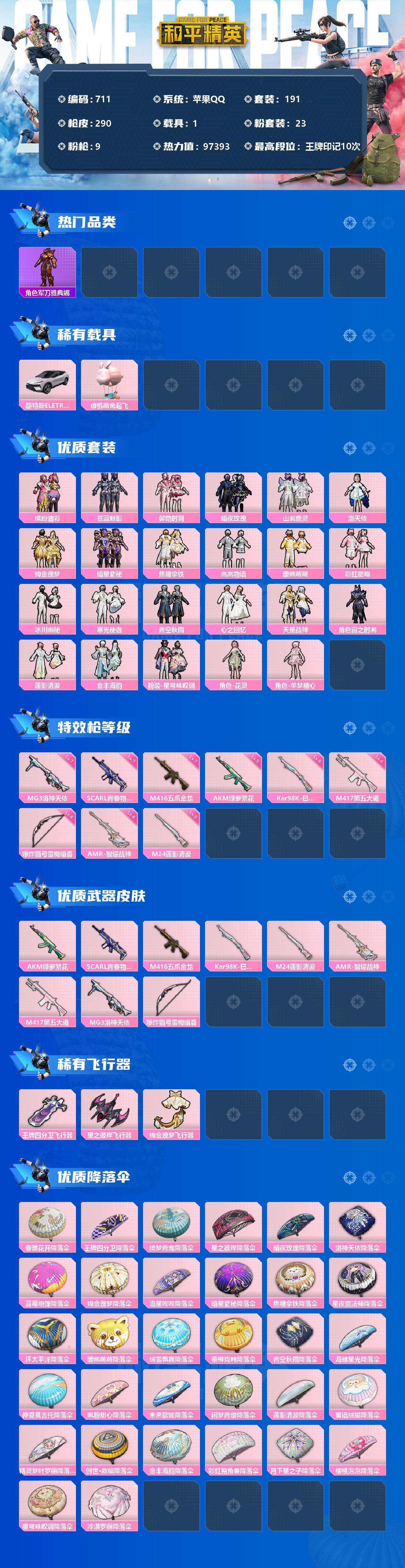 [12379398]【商品标题】:苹果 手Q-23粉装-9特效枪-1载具-3粉色飞行器-97393热力值-10王牌印记-191套装-290枪皮