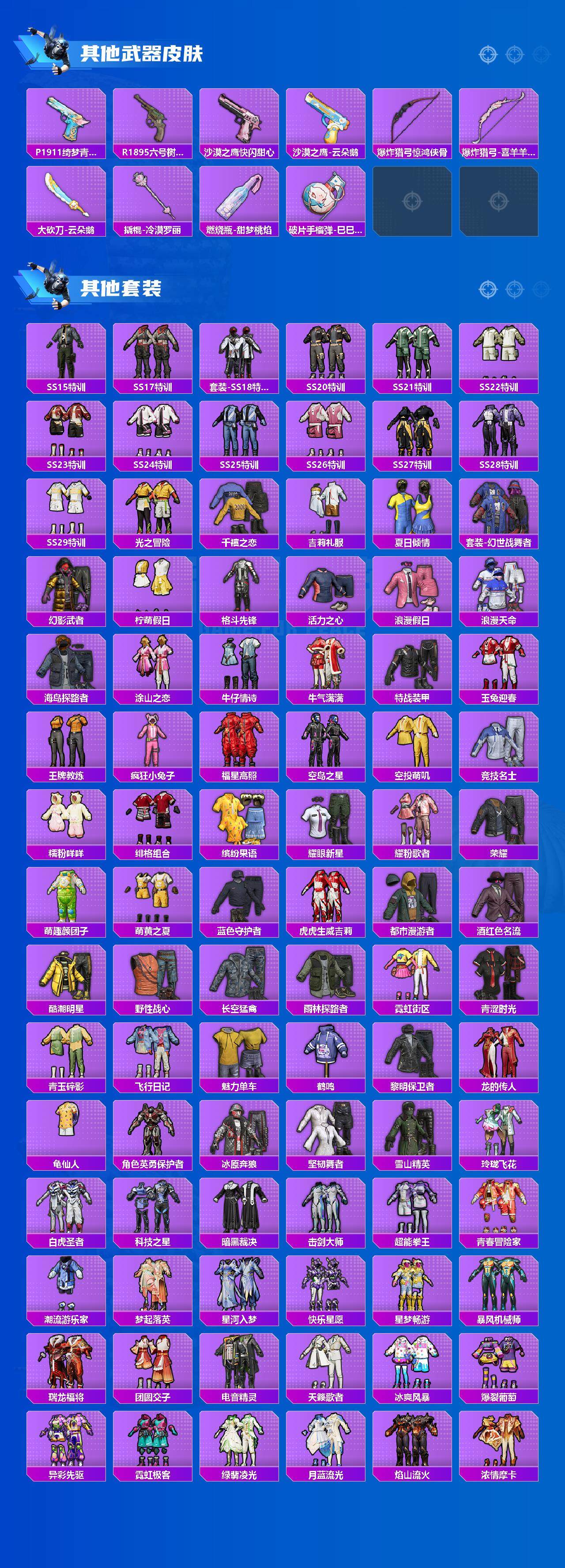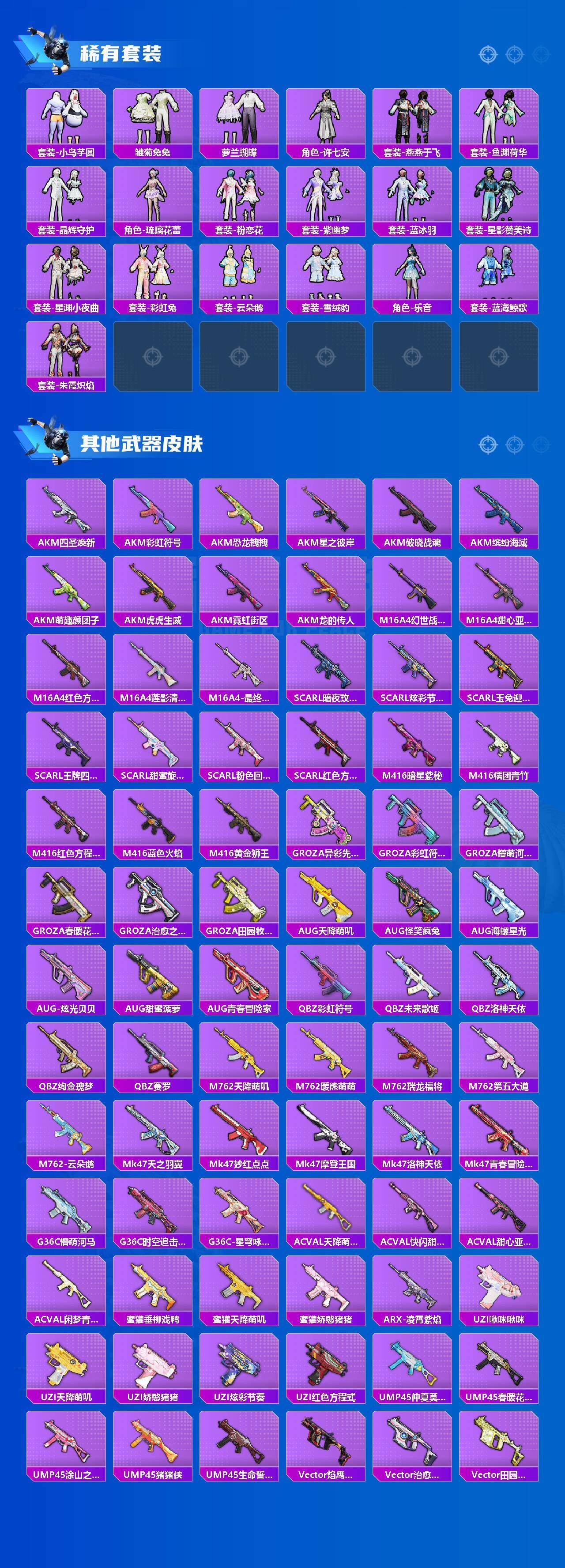 - [11575046]1红装 6粉装 10特效枪 8印记 可二次 可修改实名 优质装备:圣域龙灵-瑞拉,一级圣域龙灵-瑞拉(1级瑞拉),梦幻火箭(新101)(新火箭少女101粉色套装),M416风花雪月,GROZA焦糖拿铁,AKM星际浪客,SCAR-L-锦绣绵绵,M24镜域双华,Groza巴啦啦小魔仙,七级GROZA-焦糖拿铁,七级M416-风花雪月,AUG-暖羊咩咩,Kar98K-圣域龙灵,幻彩电音,Kar98K-巳巳如意 热门装扮:歌者泠鸢,蜜语绒猫,小蓝,金丰海韵 稀有枪皮:DP-28-豹影疾电 五级特效枪:五级Kar98K-巳巳如意,五级DP-28-豹影疾电,五级AUG-暖羊咩咩,五级SCAR-L-锦绣绵绵 四级特效枪:四级AKM-星际浪客 三级特效枪:三级Kar98K-圣域龙灵,三级M24-镜域双华 一级特效枪:一级GROZA-巴啦啦小魔仙 紫色装扮:田园牧歌,轻风白浪,和煦暖阳,SS22特训,SS23特训,摩登艾咪,龙舌兰冰茶,SS21特训,紫芒星,SS31特训套装,SS30特训套装,SS33特训套装,顶瓜瓜,吉莉礼服,浓情摩卡,魔力冰咖,都市漫游者,野性战心,长空猛禽,霓虹街区,缤纷果语,飞行日记,鹤鸣,龟仙人,冰河战士,龙魂突击队,蝶变,香桃花海,荒原牛仔,云鹰凌岚,柠萌假日,海岛探路者,空岛之星,王牌教练,SS29特训,星途旅人,白光莹,纯真浪花,热情海星,曼妙人鱼,SS28特训,冰公主,异域银装,鱼渊荷华,玉兔迎春,燕燕于飞,巳巳如意,竞技名士,摩登魅猫,街头风暴,银尘,情公主,SS24特训(SS24特训套装),湖泊玉兰,焰鹰斗篷,幻羽潜行,幽夜迷踪,SS27特训,无暇誓言,童真绒兔,萌趣绒叽,SS26特训,春光漫游,快闪甜心,贝斯之夜,智谋强哥,大橘大利,星渊小夜曲,星影赞美诗,春日漫步,粉恋花,蓝冰羽,紫幽梦,SS32特训服(SS32特训套装),青玉碎影,萌黄之夏,暗夜风云,纯白跃动,蓝调潮影,糖霜甜心,恋语绒绒,光之冒险,幽幻花璃 优质战备:精灵梦叶罗丽降落伞,星途旅人降落伞,深渊漩涡飞行器,宇宙意志降落伞,金丰海韵降落伞,千金淑猫降落伞,绝色倾城降落伞,镜域双华降落伞,镜域双华-灵镜之阶,蜜语绒猫降落伞,沙丘之主降落伞,智耀战神降落伞,圣域龙灵降落伞,圣域金龙飞行器,纯梦嫁纱降落伞,梦幻火箭降落伞