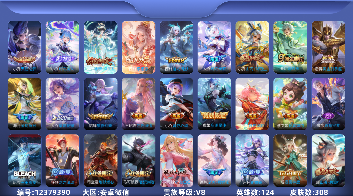 - [11626215]V8 1典藏 1无双 15传说 125英雄 223皮肤 可修改实名 优质装备:弑枪猎影(韩信典藏),器灵·螭龙剑,云鹰飞将(小将军),久胜战神,一念神魔,零号·赤焰,无双飞将,鹤羽星尊,惊梅引,霜月吟,澜逐花归海 传说皮:典韦战鼓燎原,云诺千山 珍宝阁皮:妄想食味 限定皮:愿照·九州拓(澜年限),鸣野蒿,诗剑行,五谷丰年,孙行者,美猴王,百木心枪,神器·万象笔 史诗皮:鸭鸭历险记-刘禅,化蝶舞,星界战将,谪仙醉月,龙之律动,雪豹·霜爪,百相守梦-周瑜,茶境仙,破空之剑,埋骨钱,上官婉儿群星魔术团,蔬乡物语(鲁班七号),星界特工,紫霞仙子,黄金分割率,特工魅影,江河有灵,百解令(蒙犽),高渐离燃音魔法,青蛇,偶像歌手,白蛇,暗夜猫娘,末日机甲-吕布,猫狗日记-孙策,猫狗日记-大乔,乱世虎臣,节奏热浪,修罗,女仆咖啡,水果甜心,绅士熊喵,天才门将,心灵骇客,暗隐猎兽者,鬼剑武藏,暗渊魔法,心灵战警,地狱岩魂,纤云弄巧,拒霜思,缤纷独角兽,乘风破浪,月团寄思,水晶猎龙者,曙光守护者,金属风暴,圣诞恋歌,鹰眼统帅,赏金猎手,无心,未来纪元-赵云