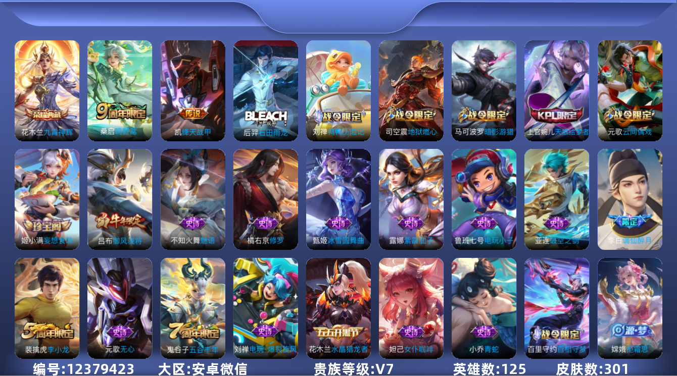 [12379423]【商品标题】:AK400-安卓WX-V7-最强王者段位-125英雄-301皮肤-1典藏-0珍品无双-0无双-0珍品传说-2传说-87史诗