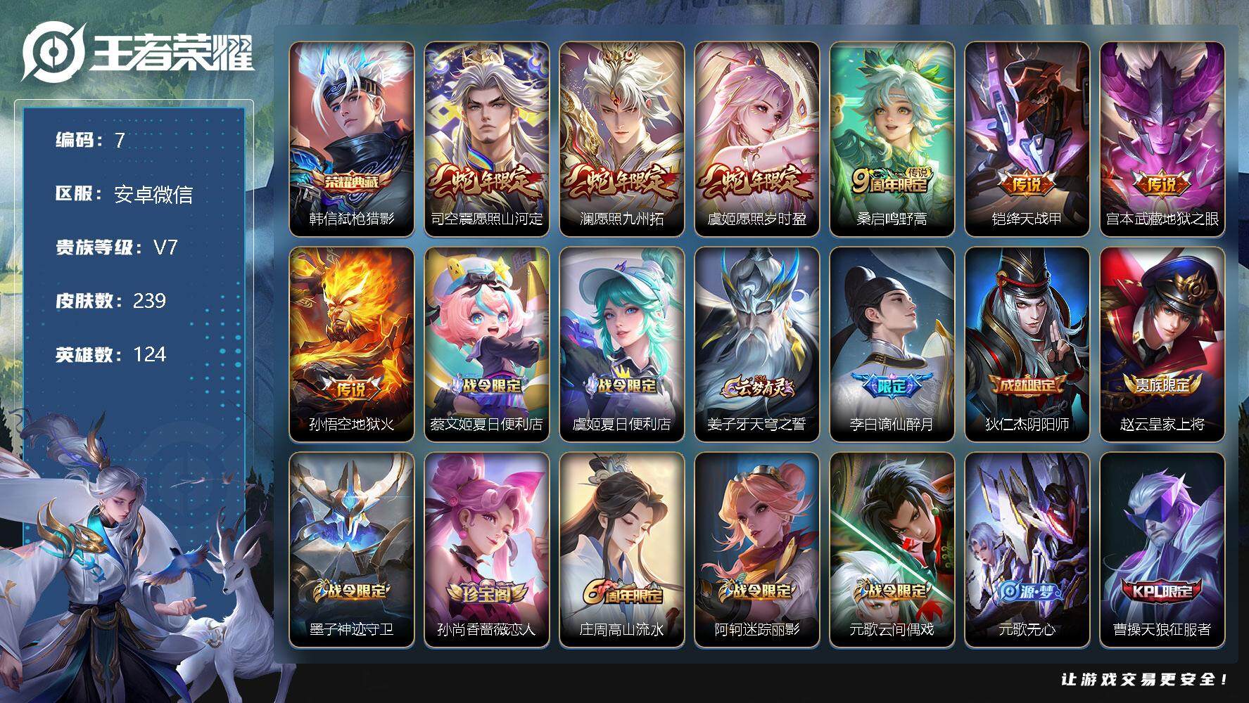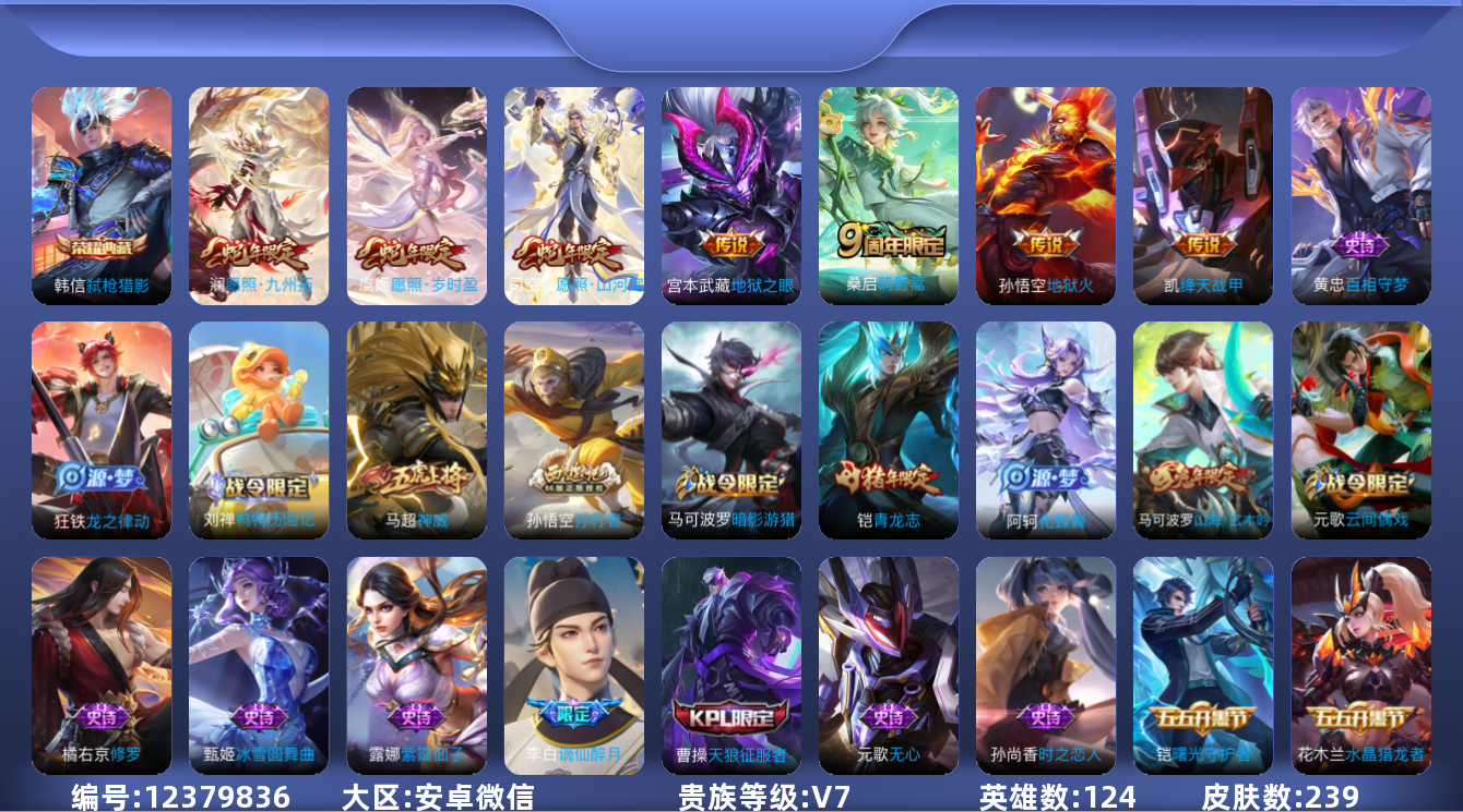 - [11605321]V7 1典藏 5传说 124英雄 257皮肤 可修改实名 优质装备:九霄神辉(木兰典藏),黄金狮子座,无双飞将 珍宝阁皮:蔷薇恋人,女武神 限定皮:愿照·九州拓(澜年限),鸣野蒿,傲雪梅枪,时雨天司(水龙头),神威(电光马子),飞衡(韩信年限),遇见飞天,高山流水,五谷丰年,游园惊梦,梁祝,天狼狩猎者,李小龙,逐梦之影,朱雀志(守约年限),猪悟能,大圣娶亲,引擎之心,冰霜恋舞曲 史诗皮:星界战将,龙之律动,藏狐·褐绒,破空之剑,紫霞仙子,苍穹之光,白龙吟,黄金分割率,特工魅影,千年之狐,永昼,电玩·爆裂旋风,江河有灵,蒙恬荣光圣徽,偶像歌手,龙骑士(小龙虾),暗夜猫娘,魅语,晚萤,青蛇,末日机甲-吕布,猫狗日记-孙策,节奏热浪,修罗,水果甜心,天才门将,星夜王子,心灵骇客,暗隐猎兽者,幽灵船长,鬼剑武藏,舞动绿茵,繁星吟游(呼啦呼啦),乘风破浪,逐浪之夏,水晶猎龙者,曙光守护者,箭羽风息,金属风暴,原初追逐者,圣诞狂欢,圣诞恋歌,鹰眼统帅,王者之锤,魅力维加斯,黎明之约,赏金猎手,未来纪元-赵云