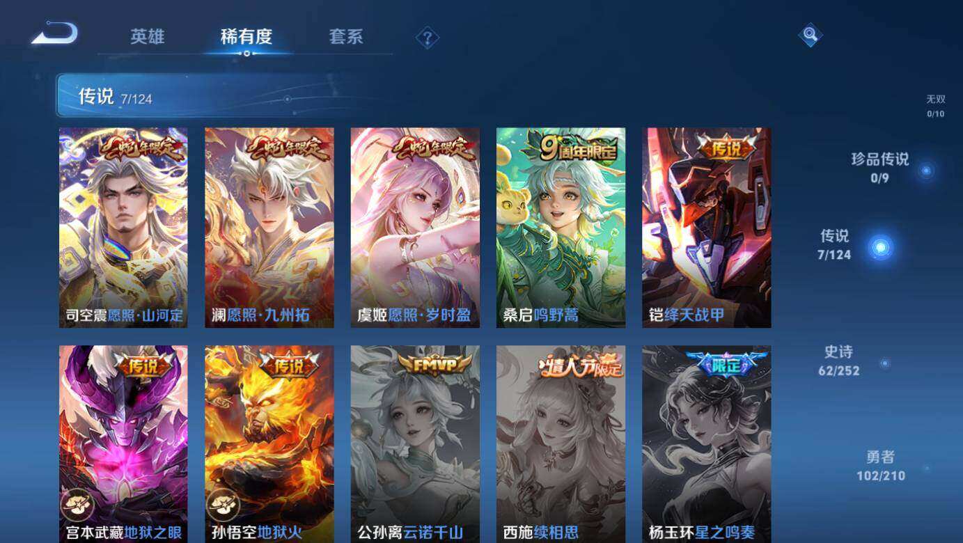 【传说皮肤】:司空震愿照山河定,澜愿照九州拓,虞姬愿照岁时盈,桑启鸣野蒿,铠绛天战甲,宫本武藏地狱之眼,孙悟空地狱火