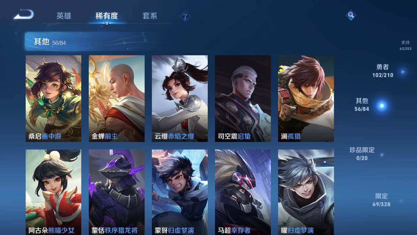 【赛季限定】:狄仁杰万华元夜,达摩沙漠行僧,老夫子醍醐杖,程咬金演武夺筹,兰陵王金庭之子,张良古海寻踪,李元芳云中旅人,钟馗驱傩正仪,鬼谷子原初探秘者,苏烈千军破阵,百里玄策原初追逐者,弈星混沌棋,沈梦溪大漠名商,明世隐疑决卦,裴擒虎擒涛扼浪,鲁班大师探海日志,桑启海盐诗旅,鬼谷子天穹祈灯,姜子牙天穹之誓