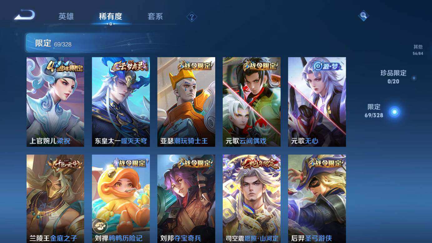 【限定皮肤】:蔡文姬夏日便利店,虞姬夏日便利店,姜子牙天穹之誓,李白谪仙醉月,狄仁杰阴阳师,赵云皇家上将,墨子神迹守卫,孙尚香蔷薇恋人,庄周高山流水,阿轲迷踪丽影,元歌云间偶戏,元歌无心,曹操天狼征服者,马可波罗暗影游猎,马可波罗山海玄木吟,狄仁杰魔术师,狄仁杰万华元夜,达摩沙漠行僧,项羽海滩派对,老夫子醍醐杖,老夫子航海奇遇记,程咬金演武夺筹,刘邦夺宝奇兵,韩信逐梦之影,兰陵王金庭之子,亚瑟潮玩骑士王,孙悟空孙行者,后羿圣弓游侠,李元芳银河之约,李元芳云中旅人,钟馗驱傩正仪,干将莫邪真爱魔法,雅典娜单词大作战,蔡文姬繁星吟游,鬼谷子原初探秘者,铠青龙志,苏烈千军破阵,百里玄策原初追逐者,弈星混沌棋,沈梦溪星空之诺,沈梦溪大漠名商,明世隐疑决卦,裴擒虎擒涛扼浪,猪八戒西部大镖客,上官婉儿梁祝,嫦娥拒霜思,西施玲珑珍味,蒙犽狂想玩偶喵,鲁班大师探海日志,桑启海盐诗旅,戈娅驭风魔法,艾琳女武神,张良古海寻踪,鬼谷子天穹祈灯,沈梦溪龙舞盛年