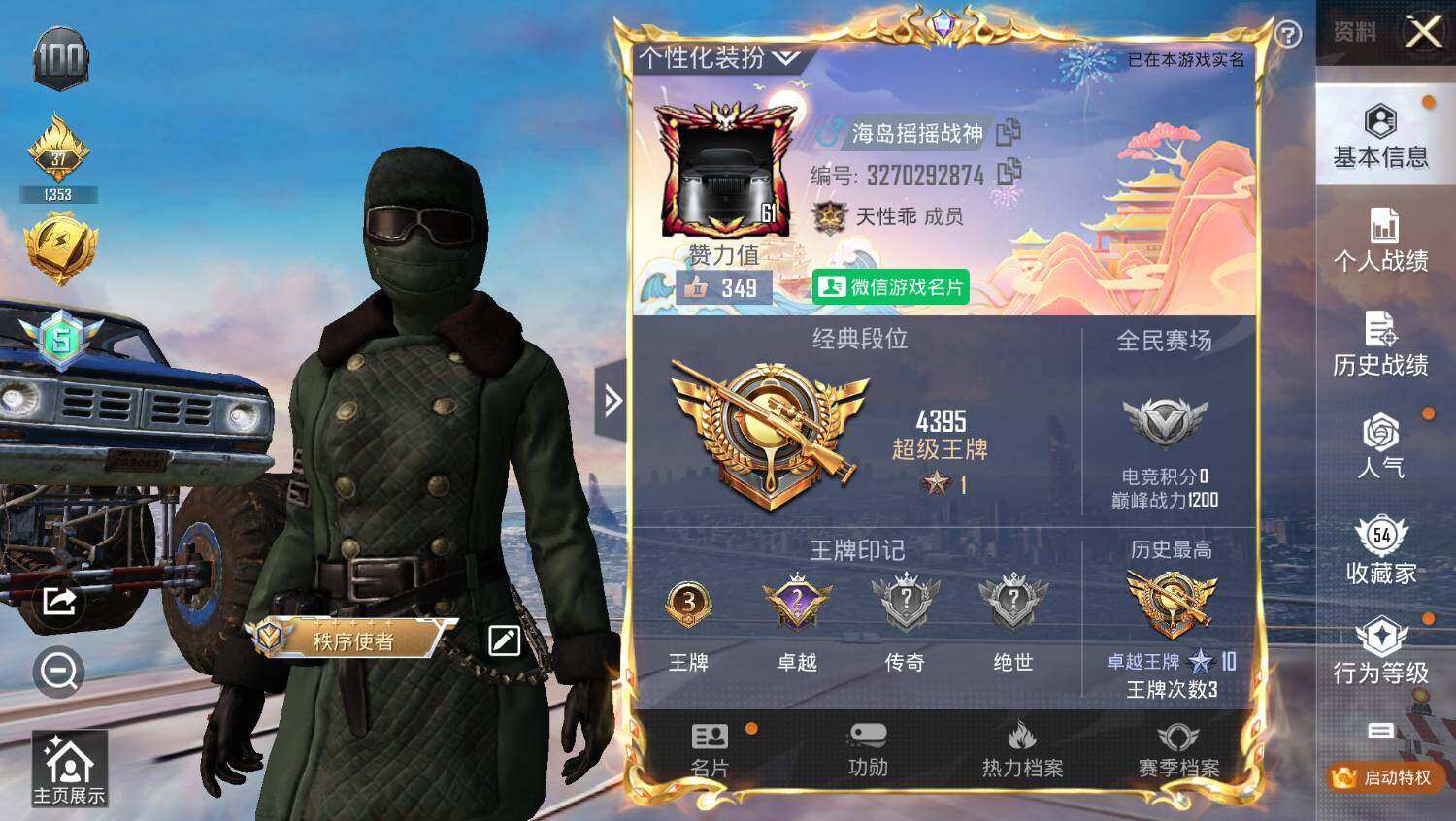 - PX_2102604-可二次 等级56 67套装 101枪皮 4王牌印记 热力值31436 2载具 2粉 2特效枪 玛莎拉蒂Ghibli(粉) 合金龙骨(绿) 满级M416-心之恋语 满级Kar98K-巳巳如意 圣堂之誓 纯珍童话 深海小丑鱼 套装-呆萌铁蟹 角色-情公主 辉耀战神全套头盔 辉耀战神全套背包
