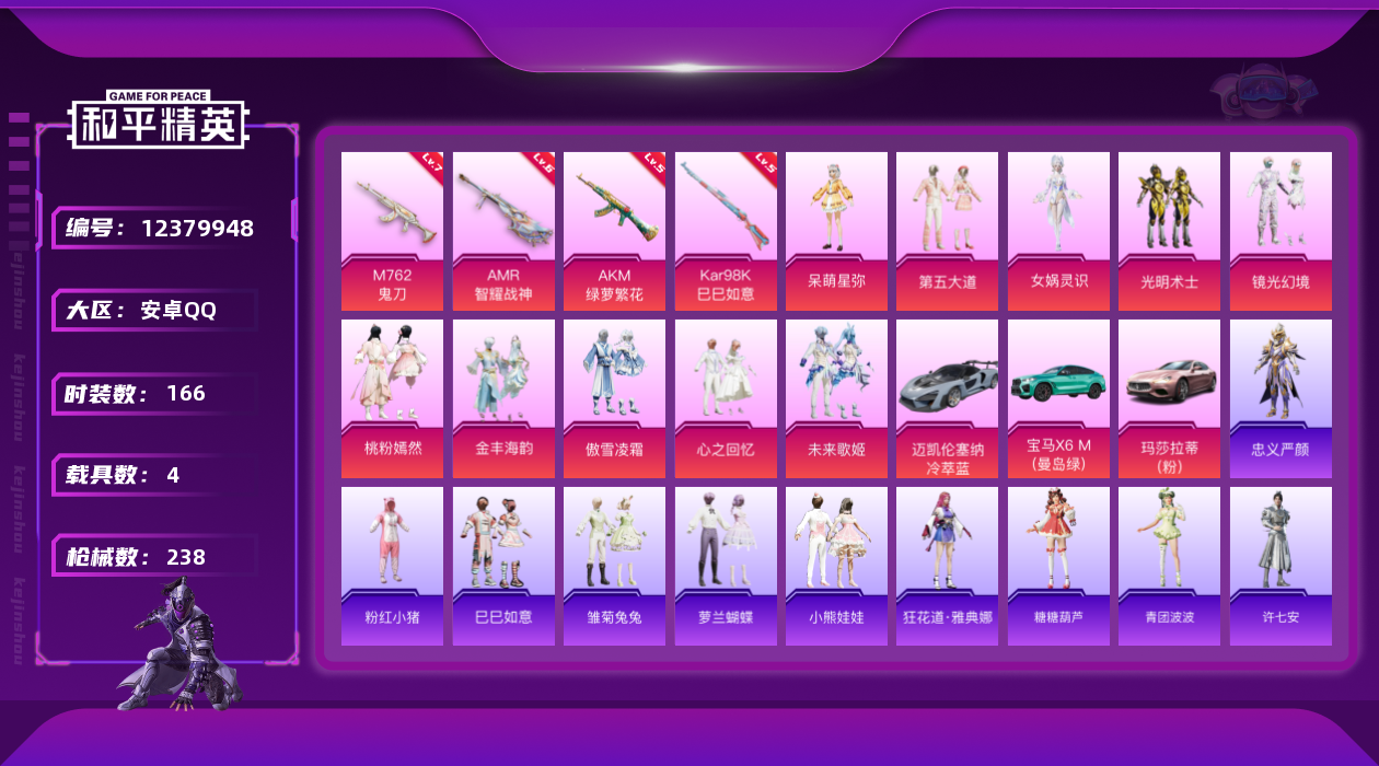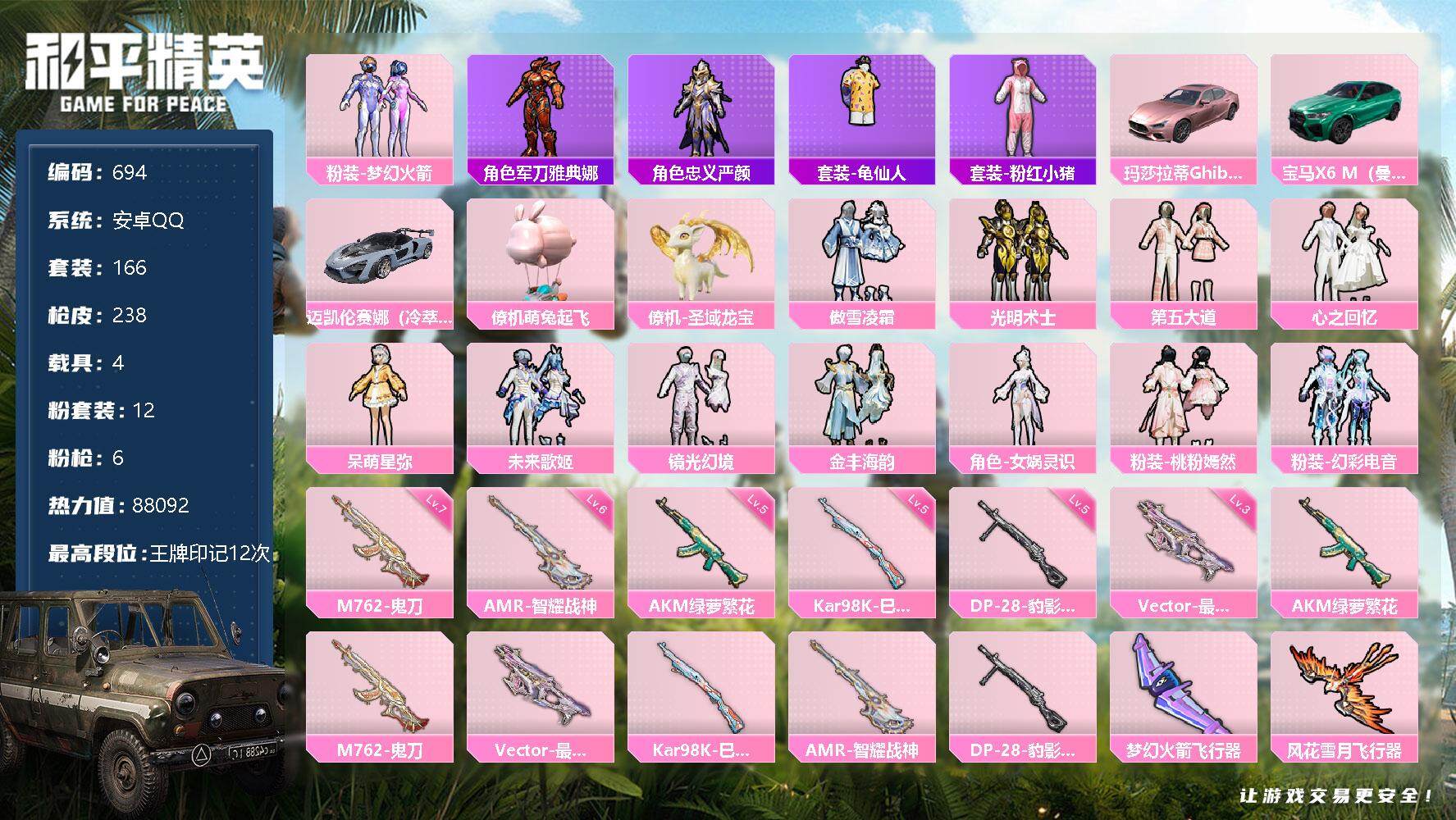 [12379948]【商品标题】:安卓 手Q-12粉装-6特效枪-4载具-5粉色飞行器-88092热力值-12王牌印记-166套装-238枪皮