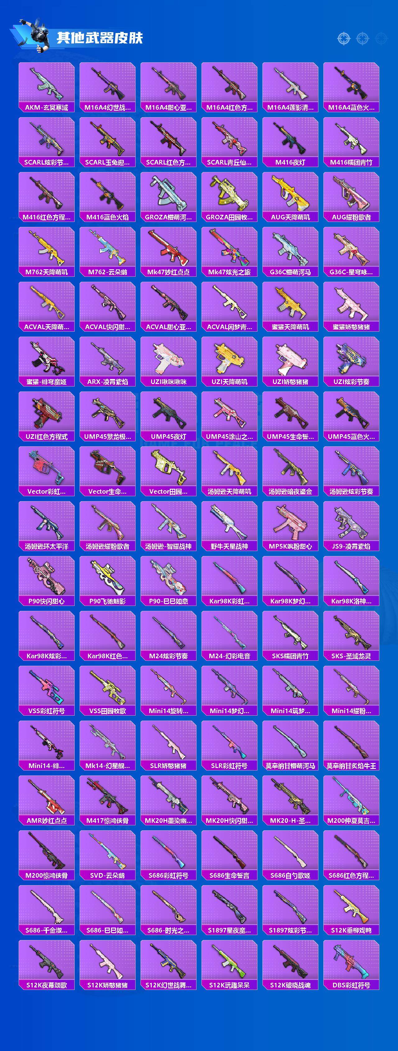 【粉色枪皮等级】:AKM-绿萝繁花(五级),M762-鬼刀(七级),Vector-最终圣卫者(三级),Kar98K-巳巳如意(五级),AMR-智耀战神(六级),DP-28-豹影疾电(五级)