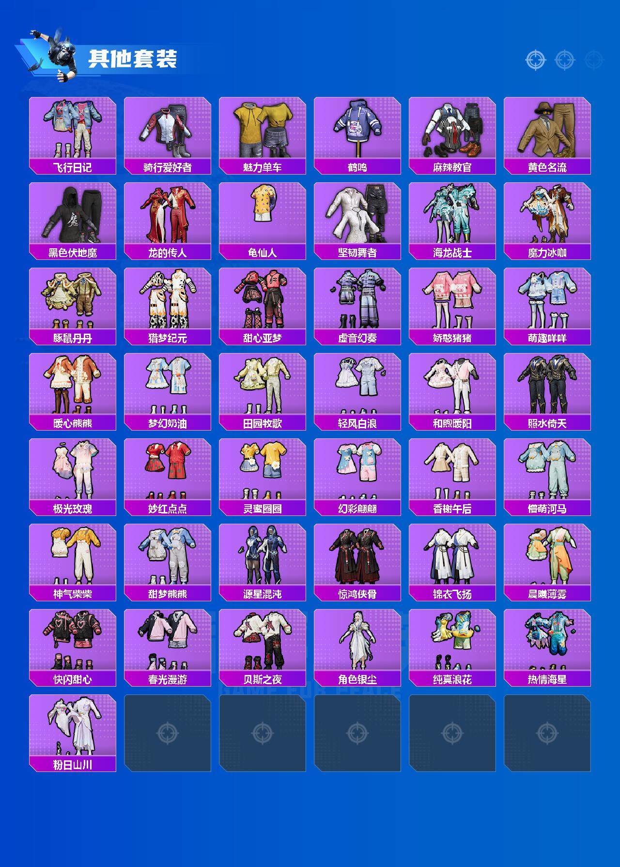 【稀有套装】:套装-龟仙人,套装-巳巳如意,套装-雏菊兔兔,套装-萝兰蝴蝶,套装-小熊娃娃,角色-狂花道·雅典娜,套装-糖糖葫芦,套装-青团波波,角色-许七安,套装-燕燕于飞,套装-鱼渊荷华,套装-粉恋花,套装-紫幽梦,套装-蓝冰羽,套装-星渊小夜曲,套装-霓虹热舞,套装-彩虹兔,套装-云朵鹅,套装-雪绒豹,套装-蓝海鲸歌,套装-朱霞炽焰,套装-凌霄紫焰