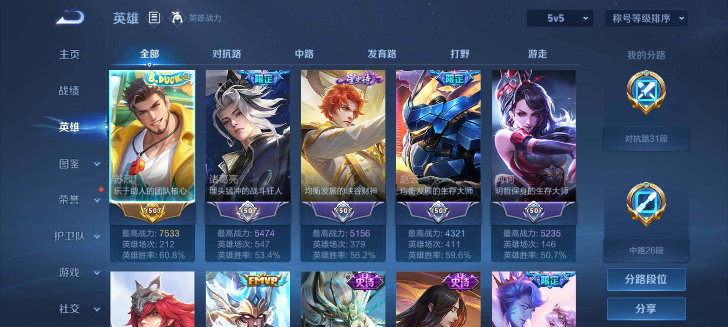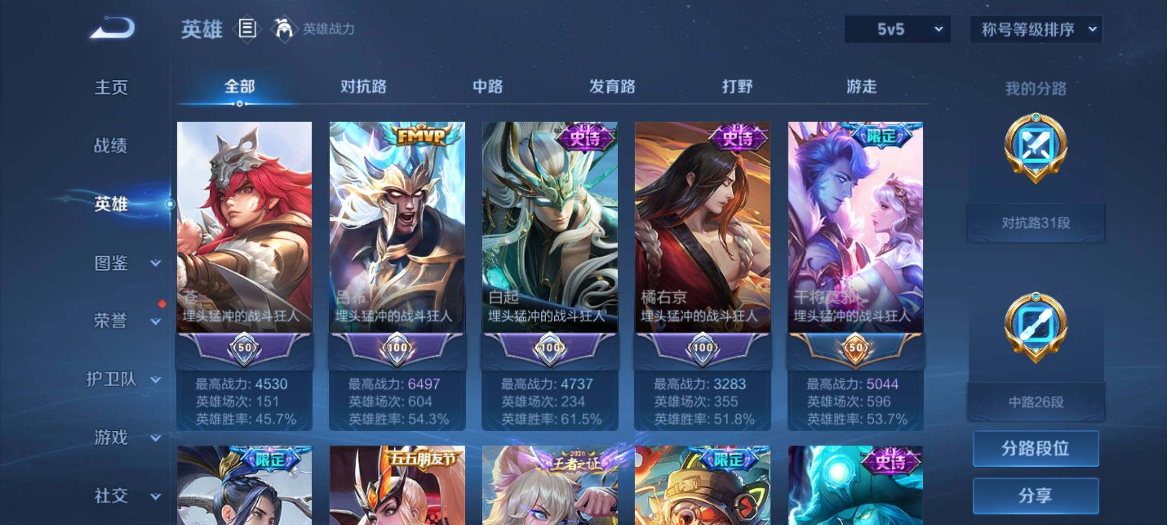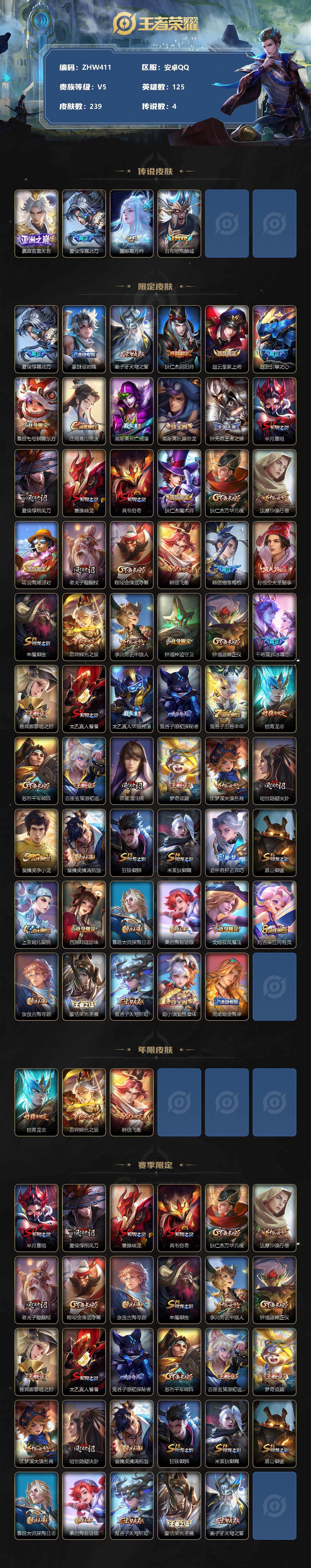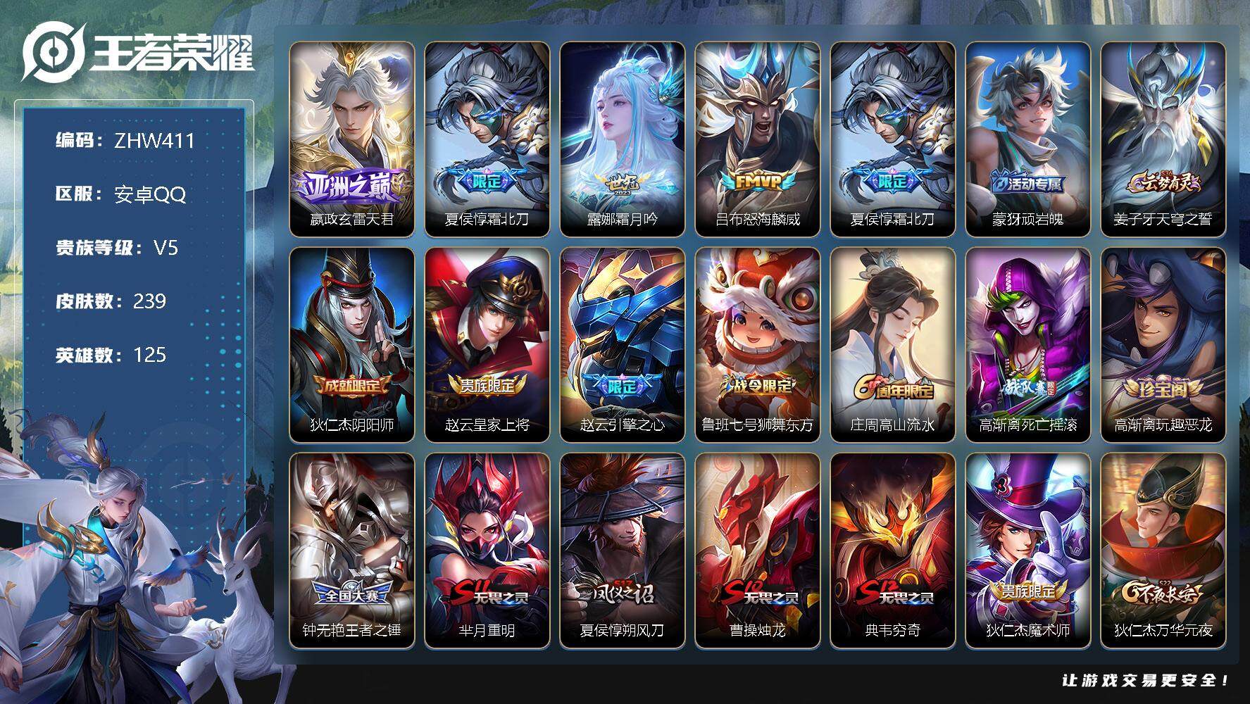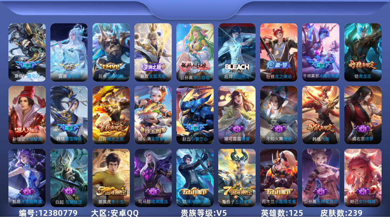 [12380779]【特价急出/详情看图】:安卓Q-V5-最强王者段位-125英雄-239皮肤-4传说-65史诗