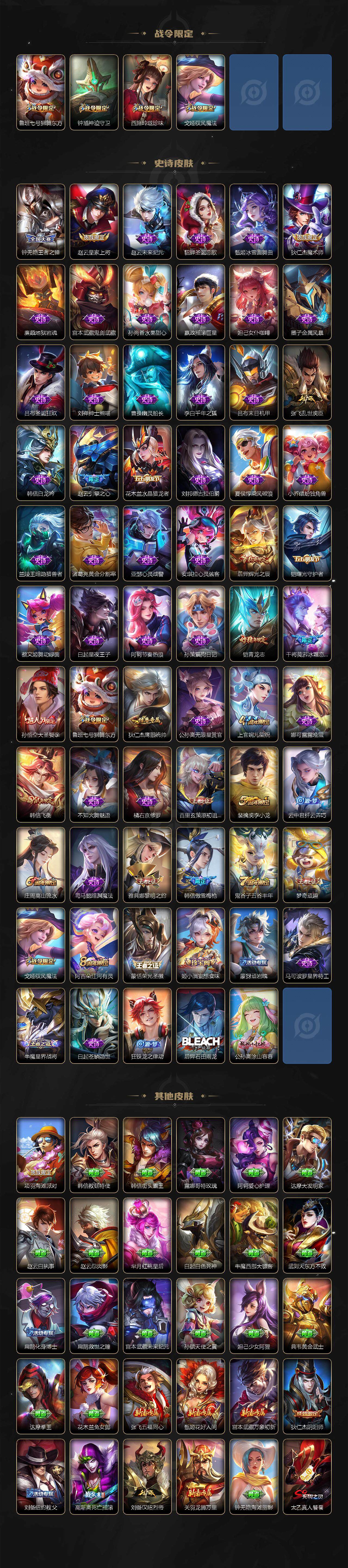 【史诗皮肤】:钟无艳王者之锤,赵云皇家上将,赵云未来纪元,貂蝉圣诞恋歌,甄姬冰雪圆舞曲,狄仁杰魔术师,廉颇地狱岩魂,宫本武藏鬼剑武藏,孙尚香水果甜心,嬴政摇滚巨星,妲己女仆咖啡,墨子金属风暴,吕布圣诞狂欢,刘禅绅士熊喵,曹操幽灵船长,李白千年之狐,吕布末日机甲,张飞乱世虎臣,韩信白龙吟,赵云引擎之心,花木兰水晶猎龙者,刘邦德古拉伯爵,夏侯惇乘风破浪,小乔缤纷独角兽,兰陵王暗隐猎兽者,诸葛亮黄金分