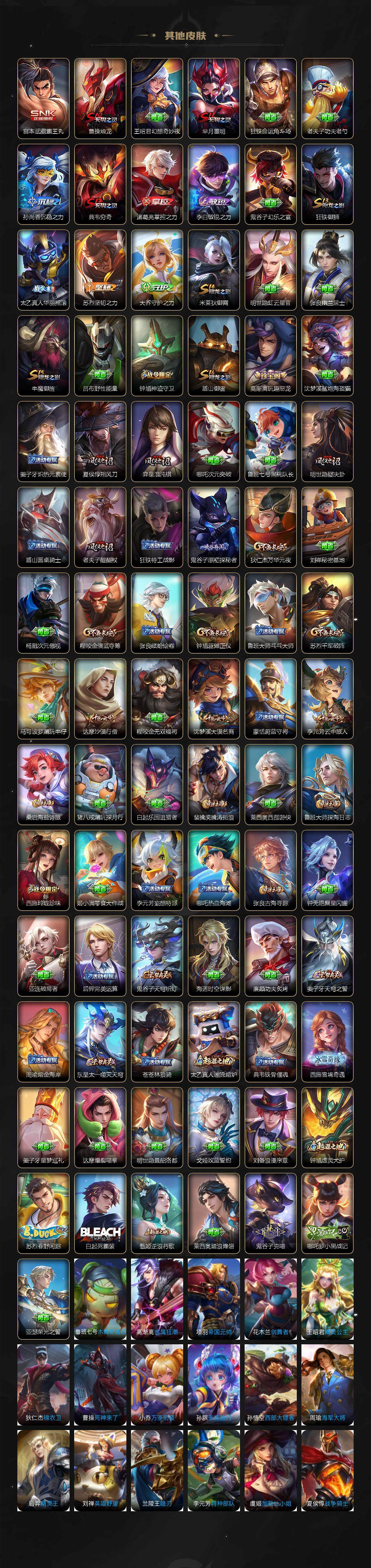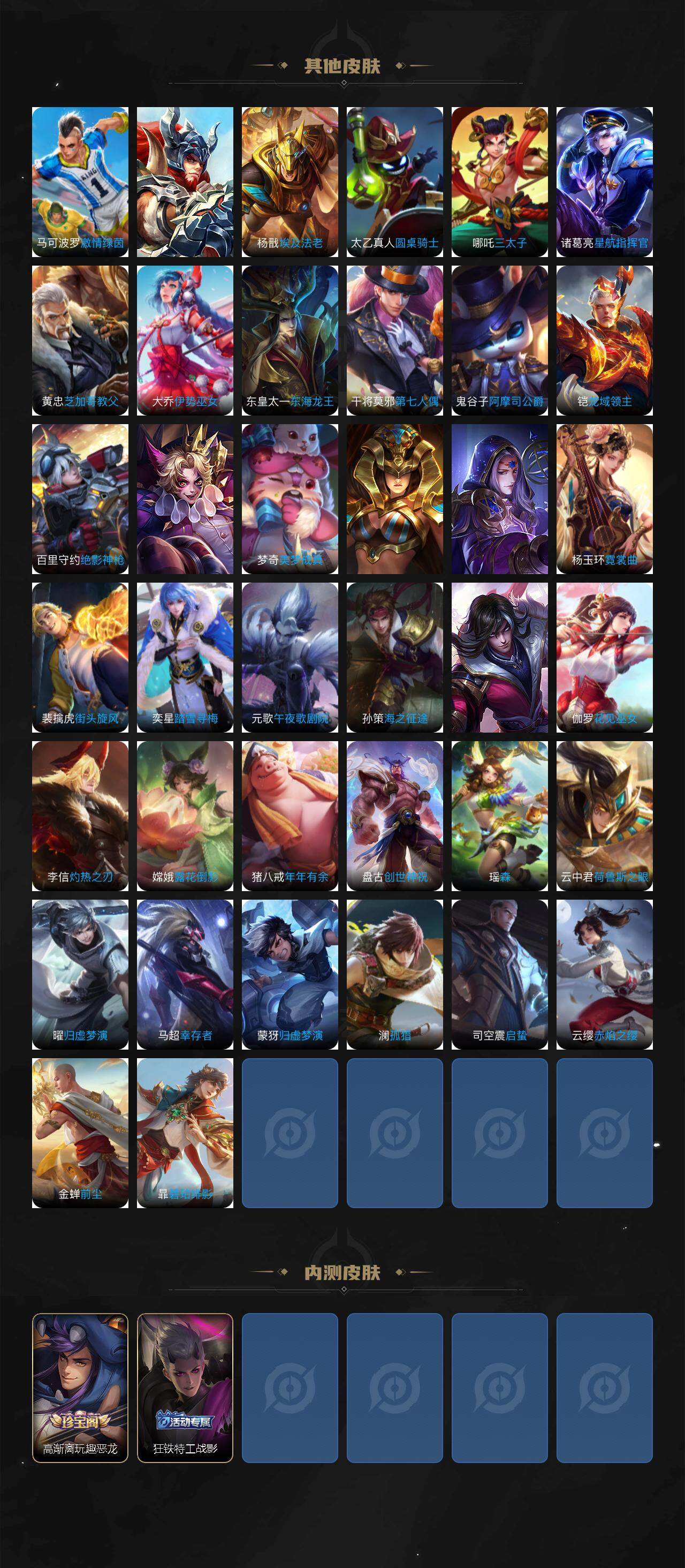 【限定皮肤】:夏侯惇霜北刀,蒙犽顽岩魄,姜子牙天穹之誓,狄仁杰阴阳师,赵云皇家上将,赵云引擎之心,鲁班七号狮舞东方,庄周高山流水,高渐离死亡摇滚,高渐离玩趣恶龙,钟无艳王者之锤,芈月重明,夏侯惇朔风刀,曹操烛龙,典韦穷奇,狄仁杰魔术师,狄仁杰万华元夜,达摩沙漠行僧,项羽海滩派对,老夫子醍醐杖,程咬金演武夺筹,韩信飞衡,韩信傲雪梅枪,孙悟空大圣娶亲,牛魔御旌,后羿辉光之辰,李元芳云中旅人,钟馗神迹守卫,钟馗驱傩正仪,干将莫邪冰霜恋舞曲,雅典娜黎明之约,太乙真人饕餮,太乙真人华丽摇滚,鬼谷子原初探秘者,鬼谷子五谷丰年,铠青龙志,苏烈千军破阵,百里玄策原初追逐者,弈星混沌棋,梦奇顽趣,沈梦溪大漠名商,明世隐疑决卦,裴擒虎李小龙,裴擒虎擒涛扼浪,狂铁御狮,米莱狄御霄,云中君纤云弄巧,盾山御銮,上官婉儿梁祝,西施玲珑珍味,鲁班大师探海日志,桑启海盐诗旅,戈娅驭风魔法,阿古朵江河有灵,张良古海寻踪,蒙恬荣光圣徽,鬼谷子天穹祈灯,姬小满妄想食味,周瑜熔金海岸