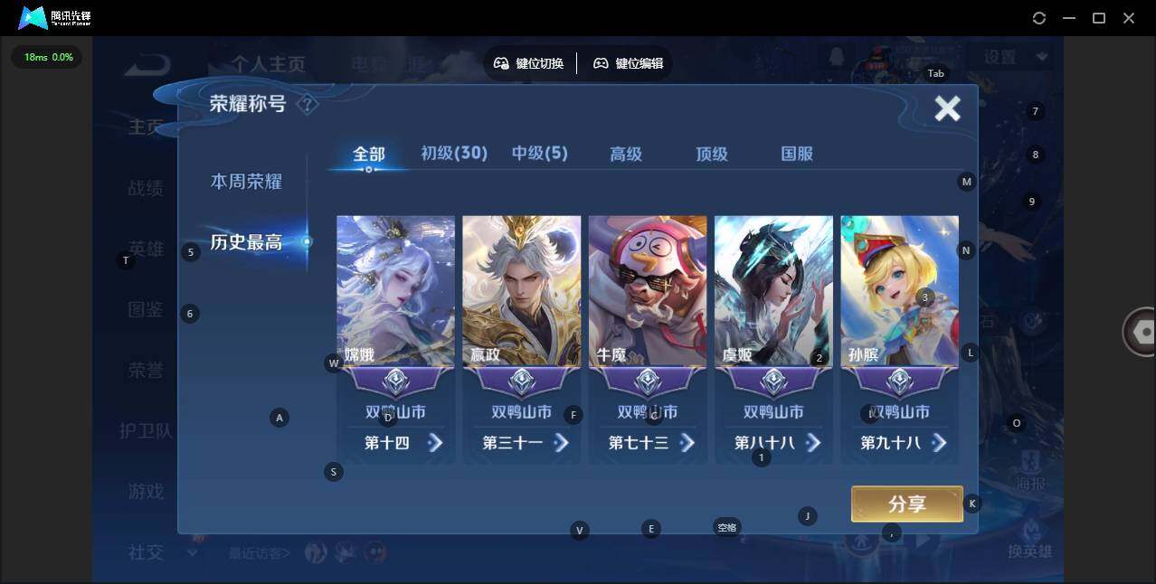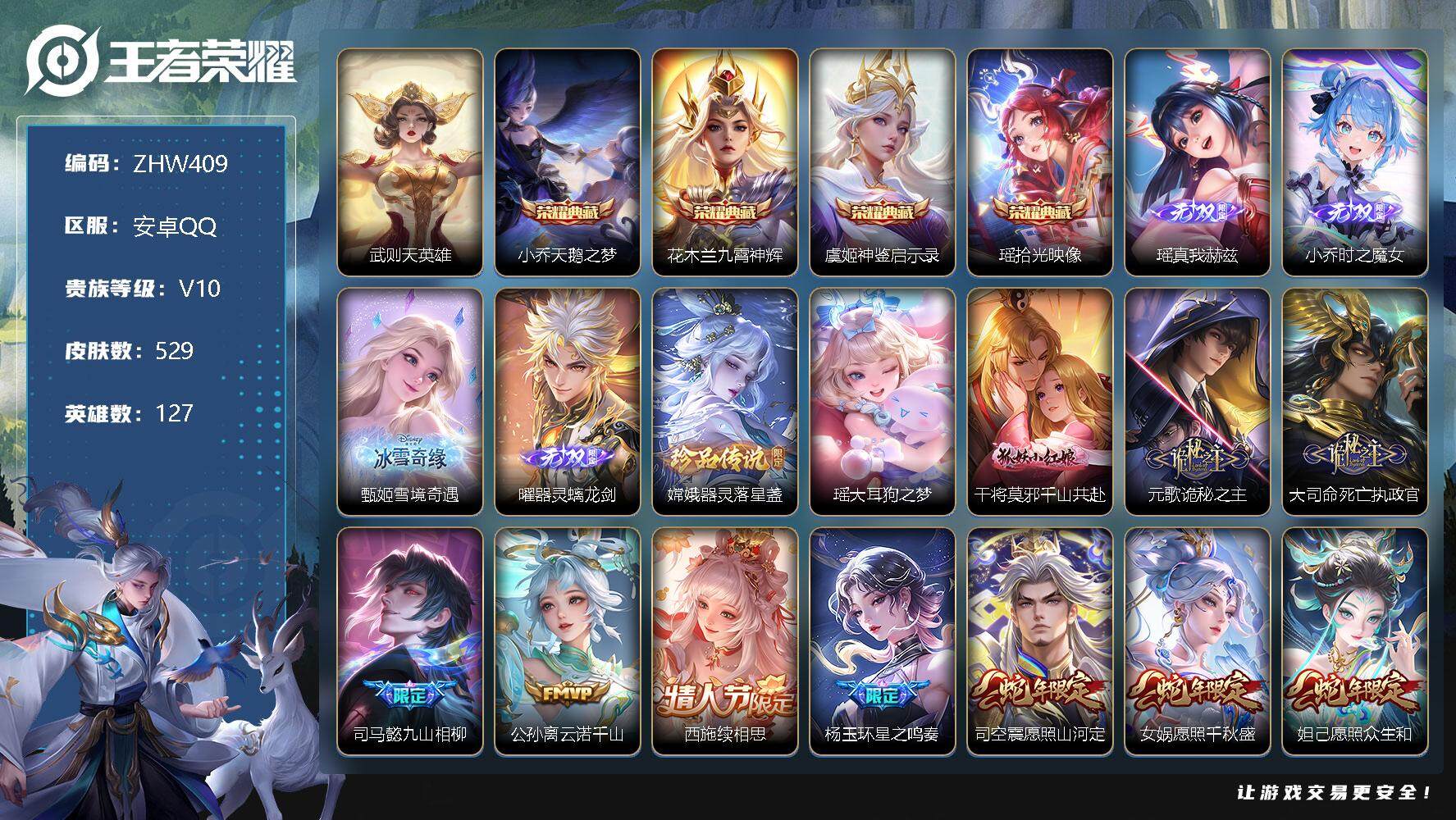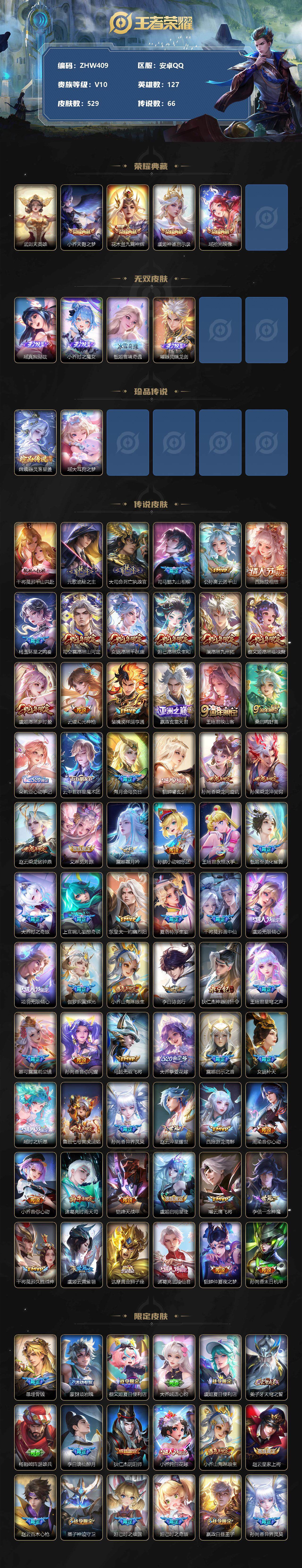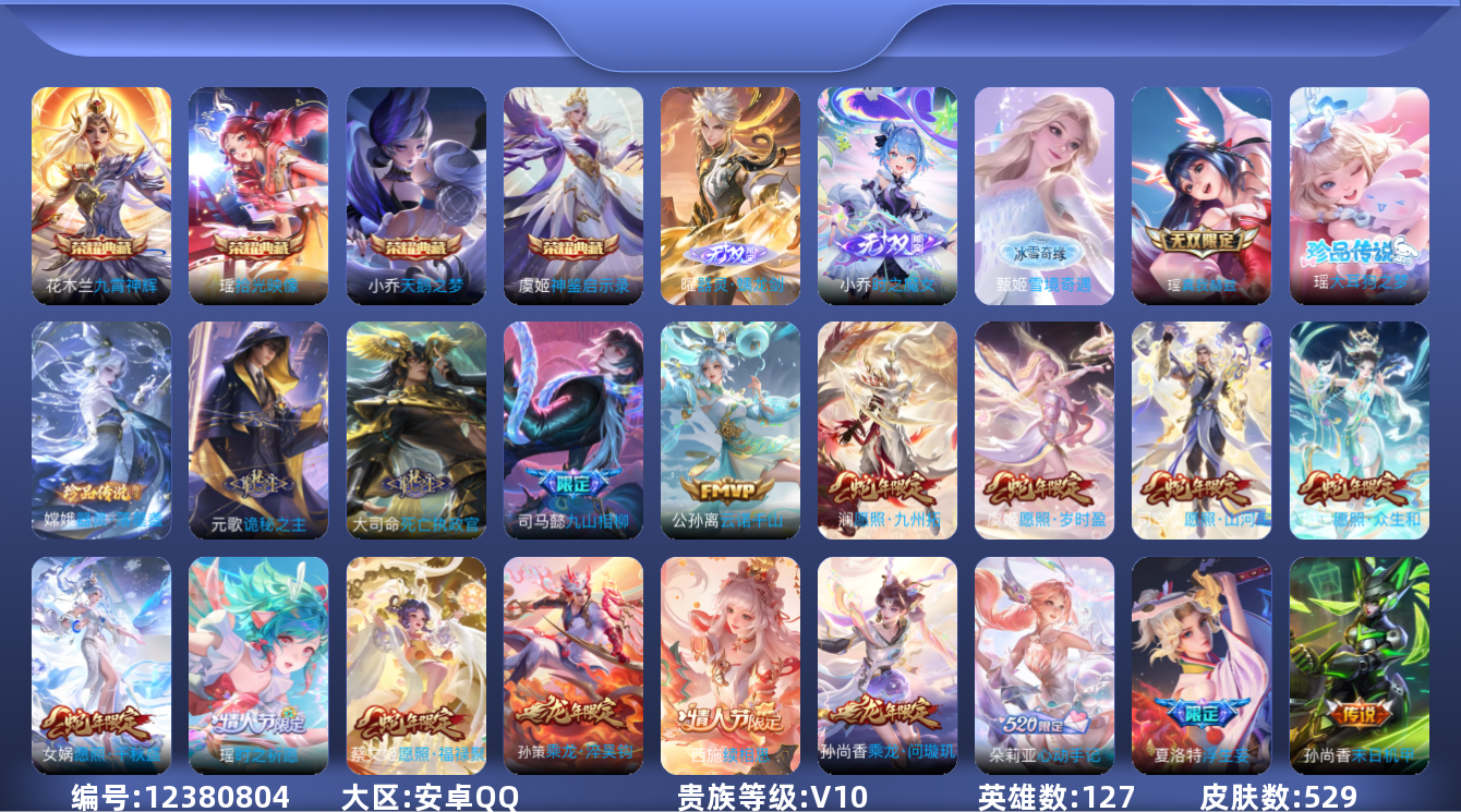 [12380804]【特价急出/详情看图】:安卓Q-V10-至尊星耀III段位-127英雄-529皮肤-4典藏-0珍品无双-4无双-2珍品传说-66传说-184史诗 瑶全皮