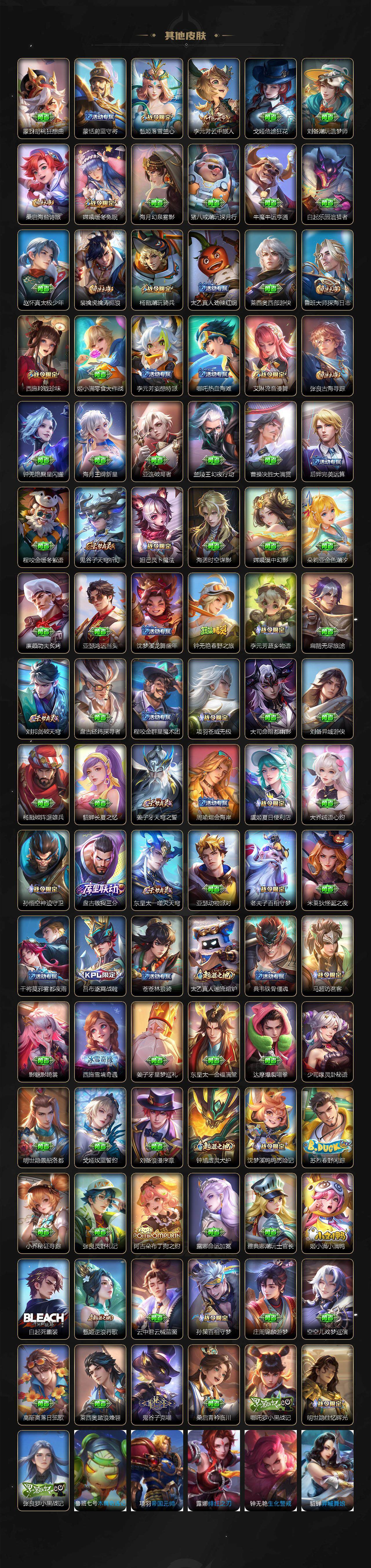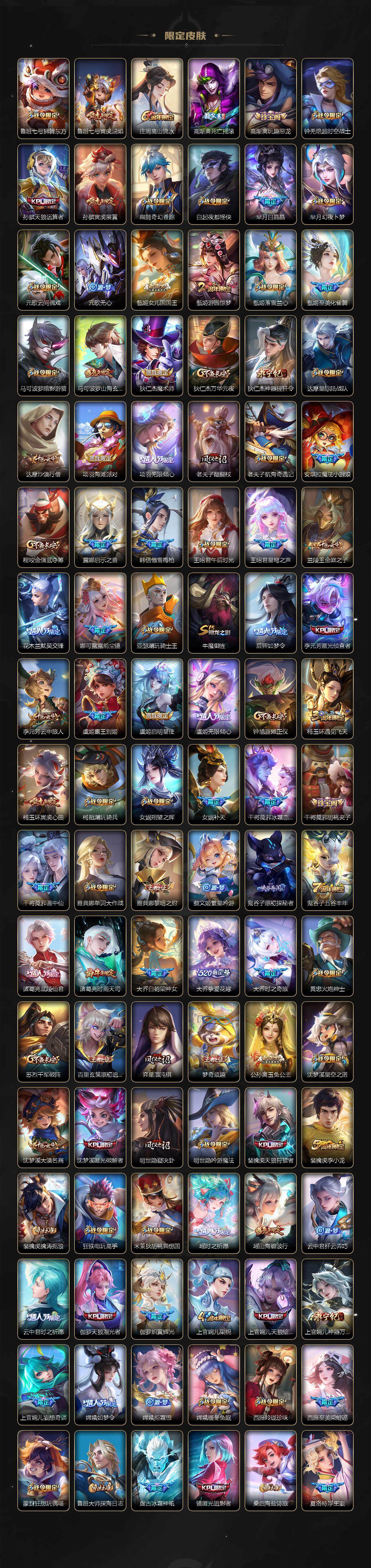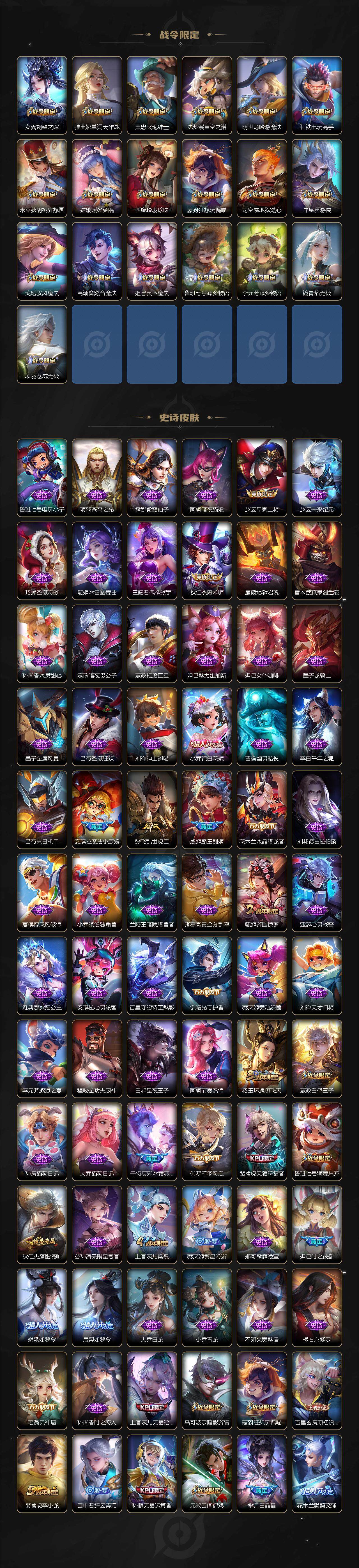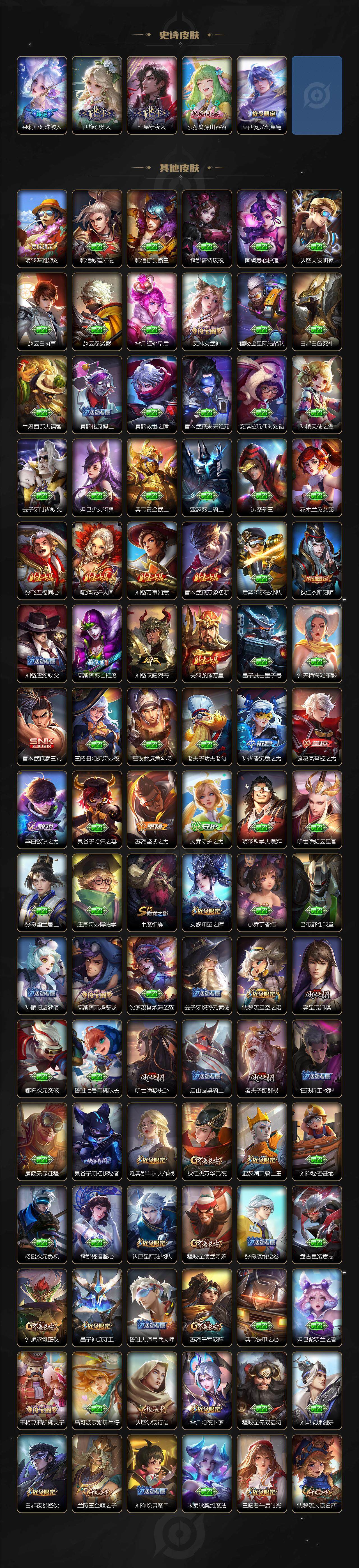 小乔青蛇,大乔白蛇,瑶遇见神鹿,娜可露露晚萤,伽罗箭羽风息,李元芳逐浪之夏,不知火舞魅语,公孙离无限星赏官,大乔猫狗日记,孙策猫狗日记,阿轲节奏热浪,露娜紫霞仙子,诸葛亮黄金分割率,王昭君偶像歌手,项羽苍穹之光,孙尚香时之恋人,阿轲暗夜猫娘,雅典娜冰冠公主,吕布末日机甲,鲁班七号电玩小子,蒙犽龙鼓争鸣,橘右京修罗,墨子龙骑士,嬴政摇滚巨星,刘禅绅士熊喵,刘禅天才门将,白起星夜王子,安琪拉心灵骇客,安琪拉时之奇旅,程咬金功夫厨神,刘邦德古拉伯爵,兰陵王暗隐猎兽者,曹操幽灵船长,宫本武藏鬼剑武藏,司马懿暗渊魔法,亚瑟心灵战警,钟馗乐园奇幻夜,杨戬天秀·启明,蔡文姬舞动绿茵,廉颇地狱岩魂,西施诗语江南,小乔缤纷独角兽,夏侯惇乘风破浪,花木兰水晶猎龙者,铠曙光守护者,百里玄策热力回旋,墨子金属风暴,百里玄策原初追逐者,吕布圣诞狂欢,貂蝉圣诞恋歌,百里守约特工魅影,嬴政暗夜贵公子,嫦娥拒霜思,雅典娜黎明之约,李白千年之狐,哪吒雪上飞焰,夏洛特永昼,艾琳奇遇舞章,貂蝉唤灵魅影,张良千筹问战,弈星滕王阁序,镜玫瑰异探,杨玉环银翎春语,沈梦溪匿光破解者,蔡文姬电玩·兔顽号,刘禅电玩·爆裂旋风,赵怀真鹤归松栖,李元芳匿光侦查者,蒙犽百解令,周瑜雪夜绮愿,高渐离燃音魔法,伽罗琥珀纪元,大乔乘龙·忆丹青,安琪拉乘龙·聚宝船,桑启奇遇星旅,上官婉儿群星魔术团,明世隐夜落电台,海诺心动手记,李白谪仙醉月,白起苍鳞隐世,赵怀真器灵·浮梦炉,亚连糖绘人间,苍狼魂孤将,狄仁杰绮世丹青