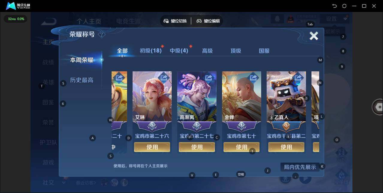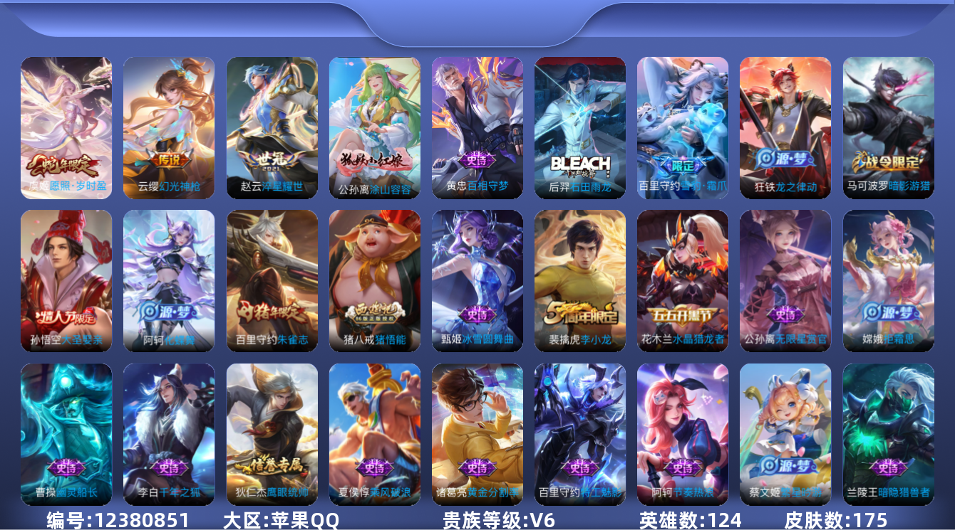 - [11714575]V7 7传说 124英雄 268皮肤 可修改实名 优质装备:久胜战神,鹤羽星尊,惊梅引 传说皮:幻光神枪 珍宝阁皮:蔷薇恋人,玩趣恶龙 限定皮:愿照·九州拓(澜年限),愿照·岁时盈(虞姬年限),逐霄战戟,陌上桑,鸣野蒿,至尊宝,魔法小厨娘,遇见飞天,高山流水,五谷丰年,游园惊梦,梁祝,岱宗(典韦年限),李小龙,如梦令-后羿,冰霜恋舞曲,美猴王 史诗皮:苍鳞隐世,化蝶舞,谪仙醉月,石田雨龙,芈月浮光幕影,苍穹之光,电玩小子(小书包),黄金分割率,千年之狐,永昼,江河有灵,匿光侦查者,末日机甲-莱西奥,鹤归松栖(赵怀真),魅语,百解令(蒙犽),偶像歌手,末日机甲-吕布,节奏热浪,女仆咖啡,水果甜心,天才门将,星夜王子,心灵骇客,德古拉伯爵,幽灵船长,鬼剑武藏,心灵战警,舞动绿茵,纤云弄巧,繁星吟游(呼啦呼啦),拒霜思,缤纷独角兽,乘风破浪,逐浪之夏,龙鼓争鸣,唤灵魅影,金属风暴,圣诞恋歌,鹰眼统帅,赏金猎手,无心,未来纪元-赵云