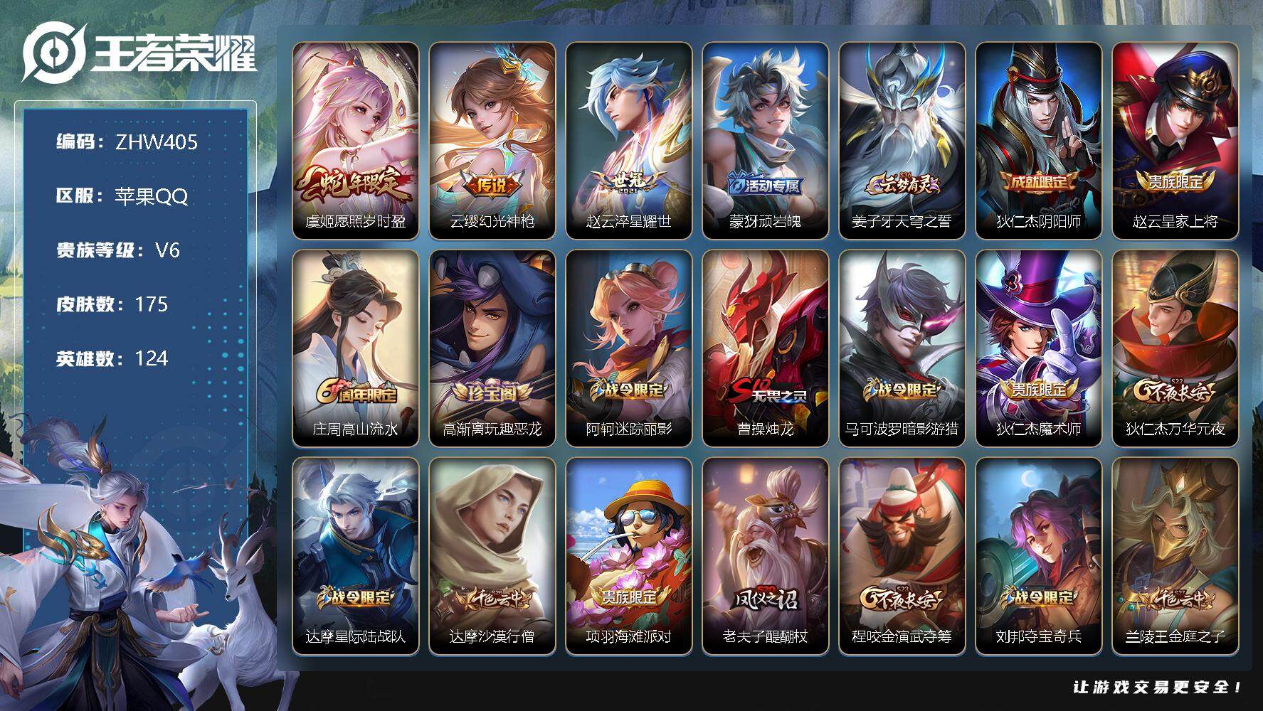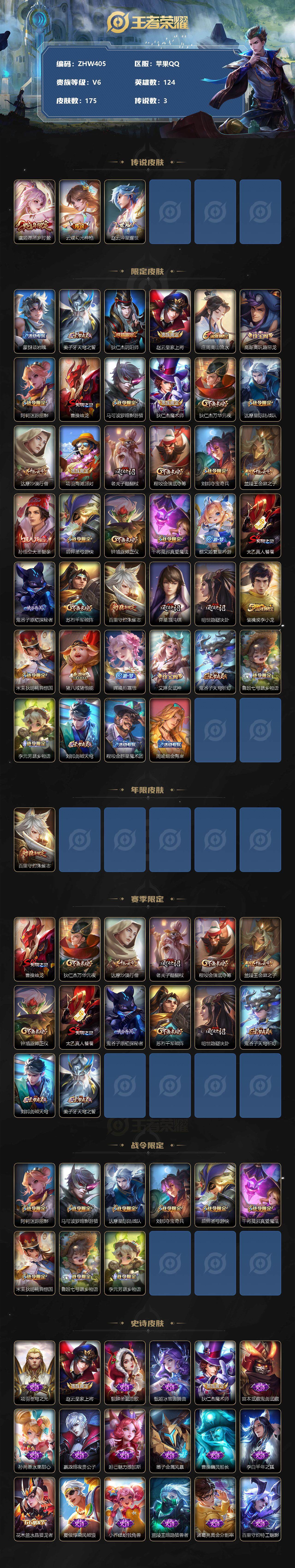 [12380851]【特价急出/详情看图】:苹果Q-V6-最强王者段位-124英雄-175皮肤--3传说-44史诗
