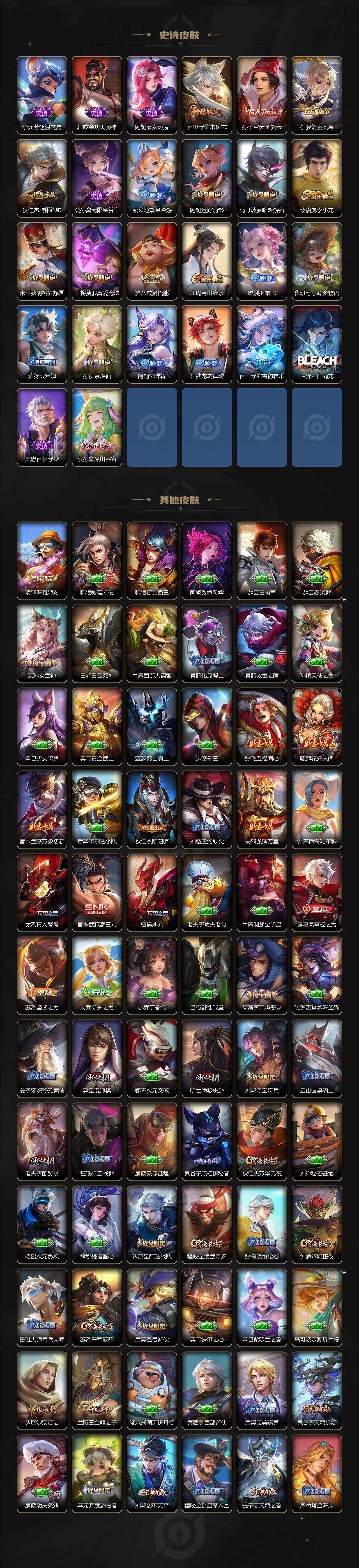 【史诗皮肤】:项羽苍穹之光,赵云皇家上将,貂蝉圣诞恋歌,甄姬冰雪圆舞曲,狄仁杰魔术师,宫本武藏鬼剑武藏,孙尚香水果甜心,嬴政暗夜贵公子,妲己魅力维加斯,墨子金属风暴,曹操幽灵船长,李白千年之狐,花木兰水晶猎龙者,夏侯惇乘风破浪,小乔缤纷独角兽,兰陵王暗隐猎兽者,诸葛亮黄金分割率,百里守约特工魅影,李元芳逐浪之夏,程咬金功夫厨神,阿轲节奏热浪,百里守约朱雀志,孙悟空大圣娶亲,伽罗箭羽风息,狄仁杰鹰眼统帅,公孙离无限星赏官,蔡文姬繁星吟游,阿轲迷踪丽影,马可波罗暗影游猎,裴擒虎李小龙,米莱狄胡桃异想国,干将莫邪真爱魔法,猪八戒猪悟能,庄周高山流水,嫦娥拒霜思,鲁班七号蔬乡物语,蒙犽顽岩魄,孙膑茶境仙,阿轲化蝶舞,狂铁龙之律动,百里守约雪豹霜爪,后羿石田雨龙,黄忠百相守梦,公孙离涂山容容