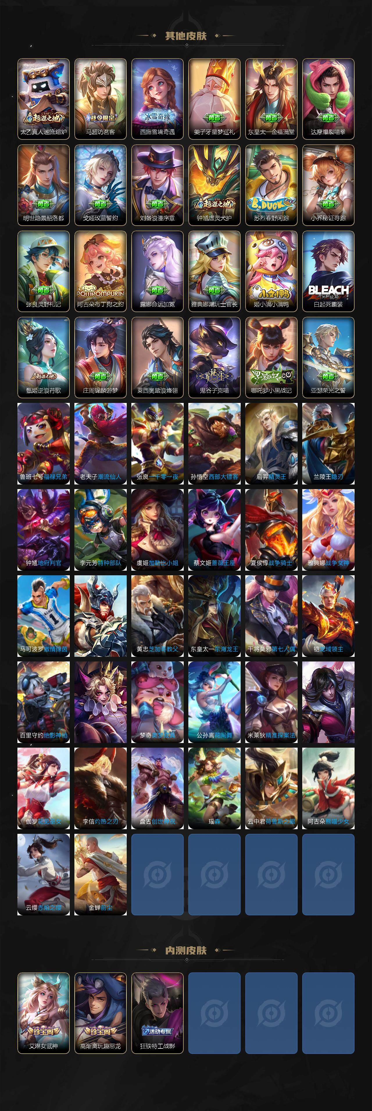 【限定皮肤】:蒙犽顽岩魄,姜子牙天穹之誓,狄仁杰阴阳师,赵云皇家上将,庄周高山流水,高渐离玩趣恶龙,阿轲迷踪丽影,曹操烛龙,马可波罗暗影游猎,狄仁杰魔术师,狄仁杰万华元夜,达摩星际陆战队,达摩沙漠行僧,项羽海滩派对,老夫子醍醐杖,程咬金演武夺筹,刘邦夺宝奇兵,兰陵王金庭之子,孙悟空大圣娶亲,后羿圣弓游侠,钟馗驱傩正仪,干将莫邪真爱魔法,蔡文姬繁星吟游,太乙真人饕餮,鬼谷子原初探秘者,苏烈千军破阵,百里守约朱雀志,弈星混沌棋,明世隐疑决卦,裴擒虎李小龙,米莱狄胡桃异想国,猪八戒猪悟能,嫦娥拒霜思,艾琳女武神,鬼谷子天穹祈灯,鲁班七号蔬乡物语,李元芳蔬乡物语,刘邦剑破天穹,程咬金群星魔术团,周瑜熔金海岸