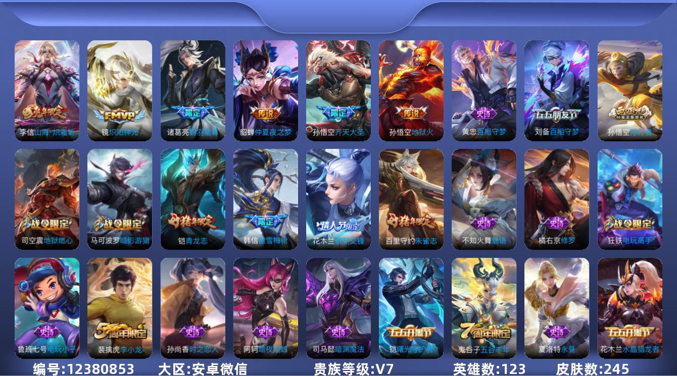 [12380853]AK463安卓WX-V7-至尊星耀II段位-123英雄-245皮肤-0典藏-0珍品无双-0无双-0珍品传说-6传说-64史诗