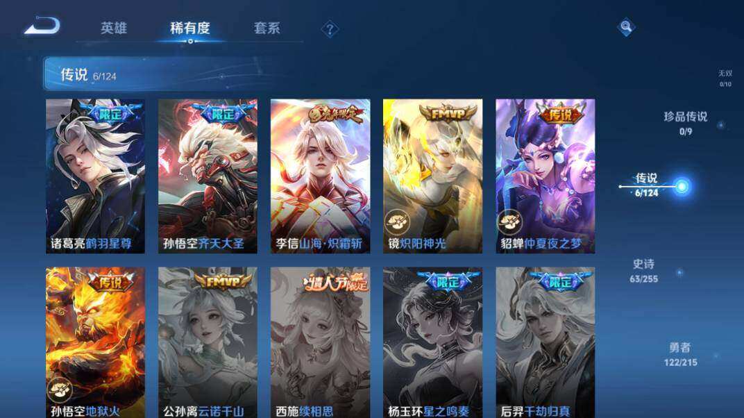 【传说皮肤】:诸葛亮鹤羽星尊,孙悟空齐天大圣,李信山海炽霜斩,镜炽阳神光,貂蝉仲夏夜之梦,孙悟空地狱火