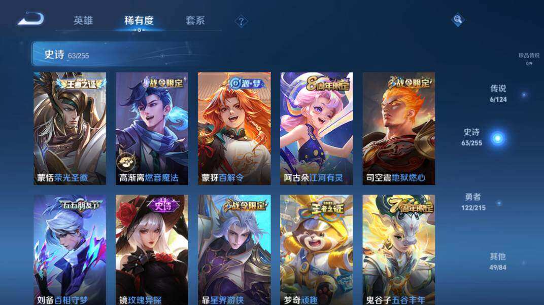 狂铁御狮,米莱狄御霄,夏侯惇朔风刀,明世隐疑决卦,老夫子醍醐杖,鬼谷子原初探秘者,狄仁杰万华元夜,程咬金演武夺筹,钟馗驱傩正仪,苏烈千军破阵,钟馗神迹守卫,鲁班七号狮舞东方,马可波罗暗影游猎,弈星混沌棋,达摩沙漠行僧,兰陵王金庭之子,沈梦溪大漠名商,李元芳云中旅人,桑启海盐诗旅,裴擒虎擒涛扼浪,鲁班大师探海日志,张良古海寻踪