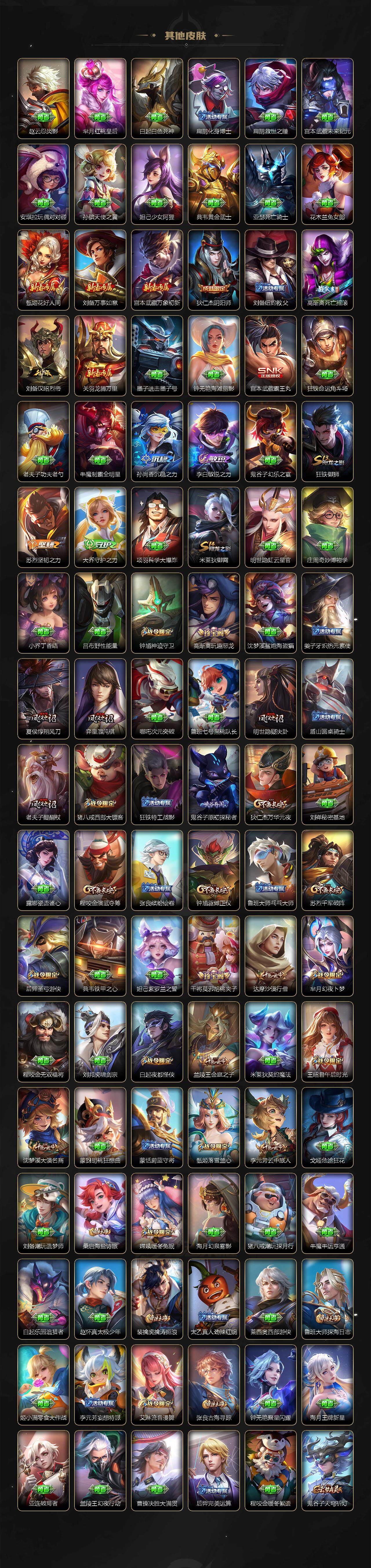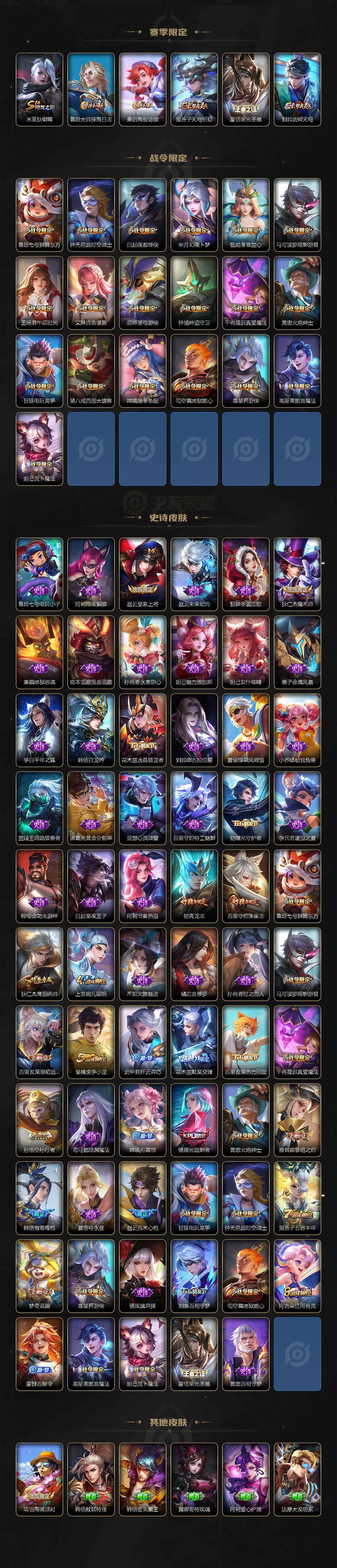 【赛季限定】:夏侯惇朔风刀,狄仁杰万华元夜,达摩沙漠行僧,老夫子醍醐杖,程咬金演武夺筹,兰陵王金庭之子,张良古海寻踪,李元芳云中旅人,钟馗驱傩正仪,雅典娜黎明之约,鬼谷子原初探秘者,苏烈千军破阵,百里玄策原初追逐者,弈星混沌棋,梦奇顽趣,沈梦溪大漠名商,明世隐疑决卦,裴擒虎擒涛扼浪,狂铁御狮,米莱狄御霄,鲁班大师探海日志,桑启海盐诗旅,鬼谷子天穹祈灯,蒙恬荣光圣徽,刘邦剑破天穹