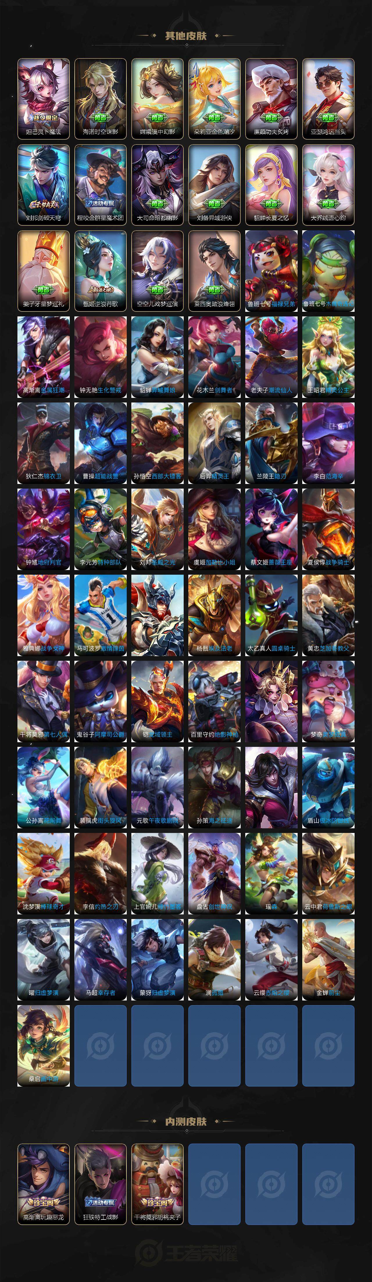 【限定皮肤】:大乔绒语心约,狄仁杰阴阳师,赵云皇家上将,赵云百木心枪,鲁班七号狮舞东方,高渐离死亡摇滚,高渐离玩趣恶龙,钟无艳超时空战士,白起夜都怪侠,芈月幻夜卜梦,夏侯惇朔风刀,甄姬落雪兰心,马可波罗暗影游猎,狄仁杰魔术师,狄仁杰万华元夜,达摩沙漠行僧,项羽海滩派对,老夫子醍醐杖,程咬金演武夺筹,韩信傲雪梅枪,王昭君午后时光,兰陵王金庭之子,花木兰默契交锋,孙悟空孙行者,孙悟空齐天大圣,后羿圣弓游侠,刘备百相守梦,李元芳云中旅人,钟馗神迹守卫,钟馗驱傩正仪,干将莫邪胡桃夹子,干将莫邪真爱魔法,雅典娜黎明之约,鬼谷子原初探秘者,鬼谷子五谷丰年,诸葛亮鹤羽星尊,黄忠火炮绅士,铠青龙志,苏烈千军破阵,百里玄策原初追逐者,百里守约朱雀志,弈星混沌棋,梦奇顽趣,沈梦溪大漠名商,明世隐疑决卦,裴擒虎李小龙,裴擒虎擒涛扼浪,狂铁御狮,狂铁电玩高手,米莱狄御霄,云中君纤云弄巧,李信山海炽霜斩,猪八戒西部大镖客,上官婉儿梁祝,嫦娥拒霜思,嫦娥暖冬兔眠,鲁班大师探海日志,镜匿光追影者,桑启海盐诗旅,暃星界游侠,艾琳流音漫舞,司空震地狱燃心,阿古朵江河有灵,张良古海寻踪,蒙犽百解令,蒙恬荣光圣徽,高渐离燃音魔法,妲己灵卜魔法,鬼谷子天穹祈灯,刘邦剑破天穹,程咬金群星魔术团,刘备异域游侠