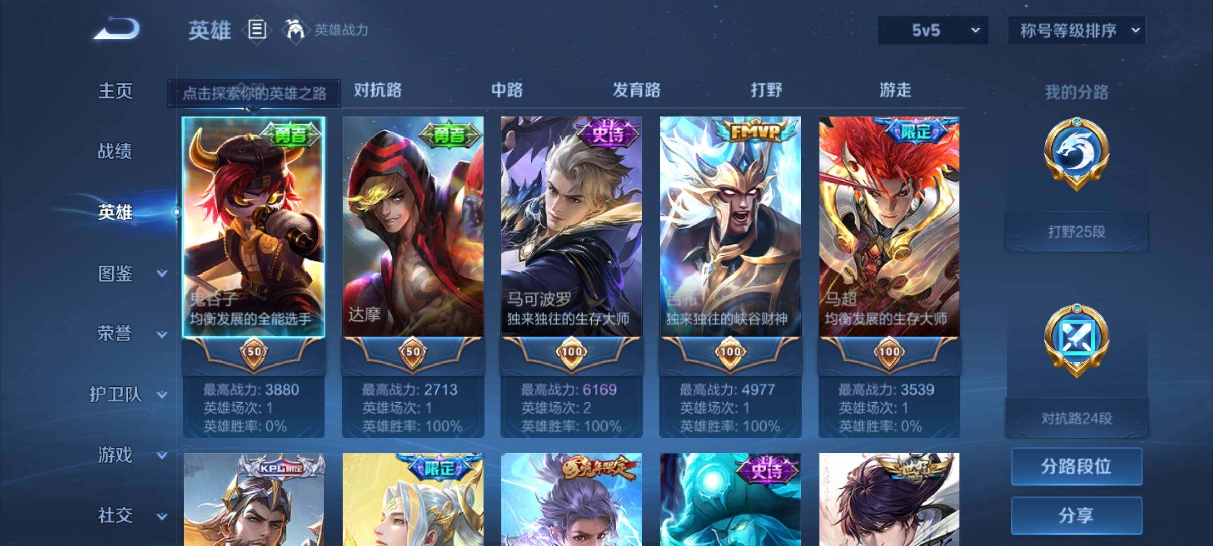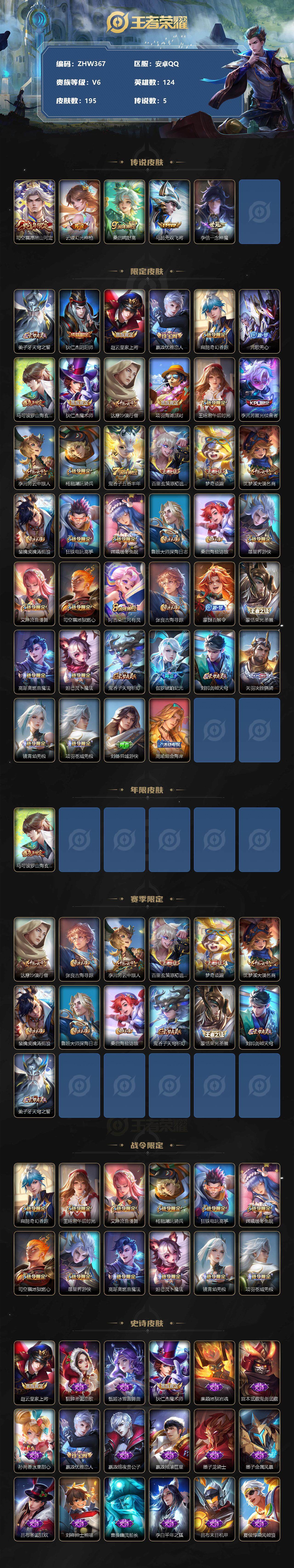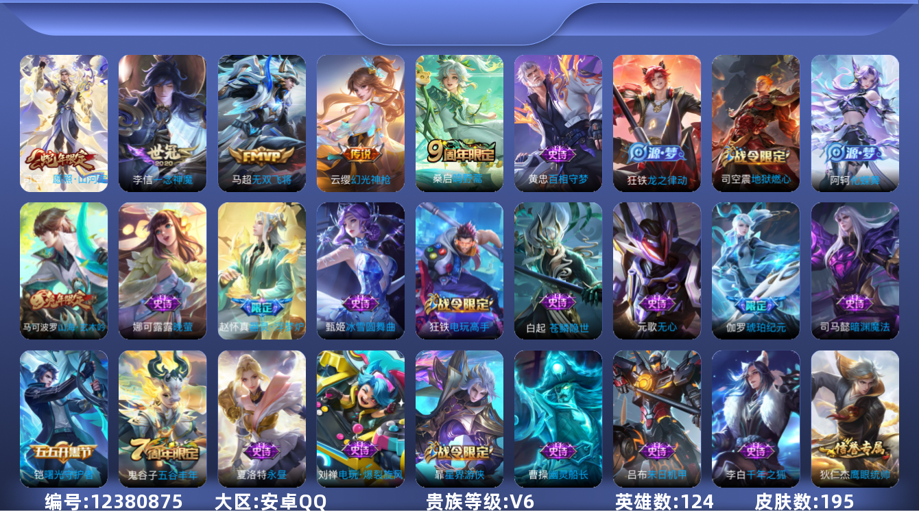 [12380875]【特价急出/详情看图】:安卓Q-V6-至尊星耀V段位-124英雄-195皮肤-5传说-53史诗