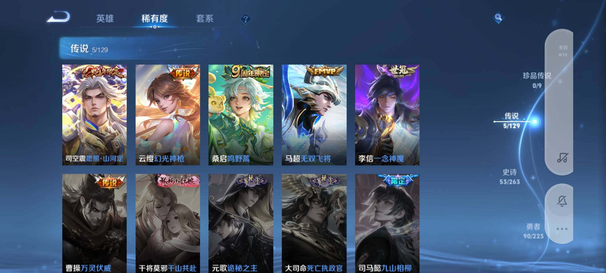 【传说皮肤】:司空震愿照山河定,云缨幻光神枪,桑启鸣野蒿,马超无双飞将,李信一念神魔