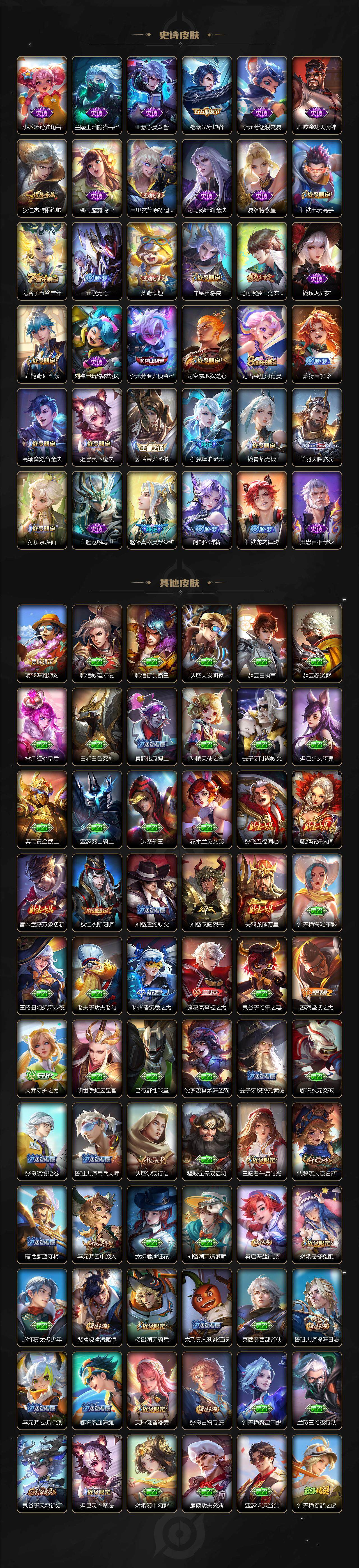 【史诗皮肤】:赵云皇家上将,貂蝉圣诞恋歌,甄姬冰雪圆舞曲,狄仁杰魔术师,廉颇地狱岩魂,宫本武藏鬼剑武藏,孙尚香水果甜心,嬴政优雅恋人,嬴政暗夜贵公子,嬴政摇滚巨星,墨子龙骑士,墨子金属风暴,吕布圣诞狂欢,刘禅绅士熊喵,曹操幽灵船长,李白千年之狐,吕布末日机甲,夏侯惇乘风破浪,小乔缤纷独角兽,兰陵王暗隐猎兽者,亚瑟心灵战警,铠曙光守护者,李元芳逐浪之夏,程咬金功夫厨神,狄仁杰鹰眼统帅,娜可露露晚萤,百里玄策原初追逐者,司马懿暗渊魔法,夏洛特永昼,狂铁电玩高手,鬼谷子五谷丰年,元歌无心,梦奇顽趣,暃星界游侠,马可波罗山海玄木吟,镜玫瑰异探,扁鹊奇幻香踪,刘禅电玩爆裂旋风,李元芳匿光侦查者,司空震地狱燃心,阿古朵江河有灵,蒙犽百解令,妲己灵卜魔法,高渐离燃音魔法,蒙恬荣光圣徽,伽罗琥珀纪元,镜青焰无极,关羽决胜骁骑,孙膑茶境仙,白起苍鳞隐