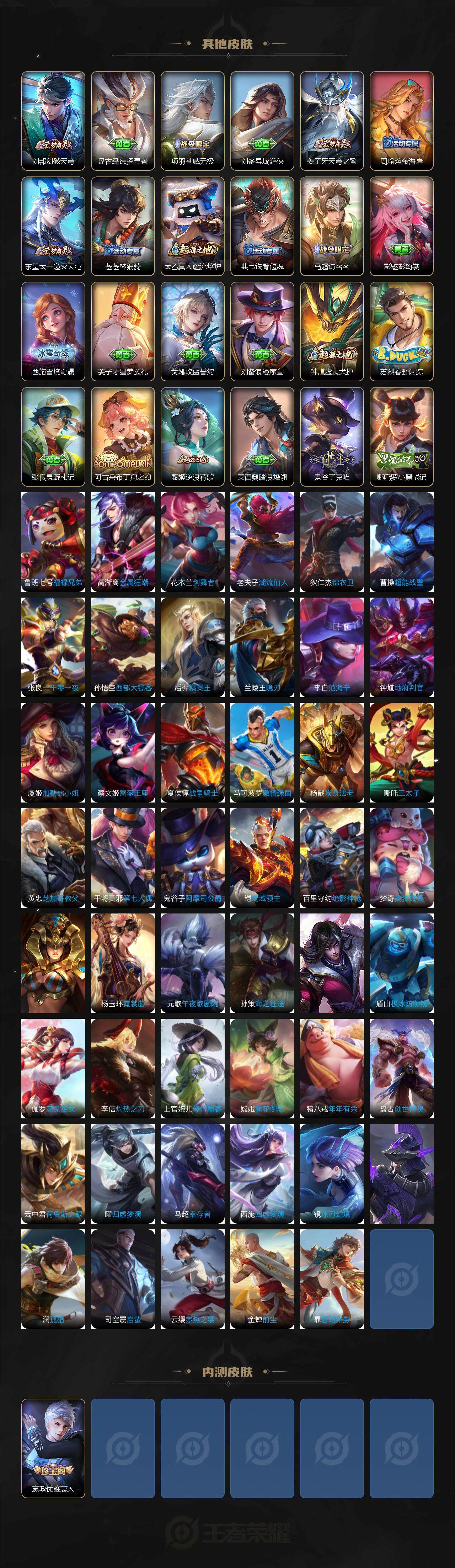 【赛季限定】:达摩沙漠行僧,张良古海寻踪,李元芳云中旅人,百里玄策原初追逐者,梦奇顽趣,沈梦溪大漠名商,裴擒虎擒涛扼浪,鲁班大师探海日志,桑启海盐诗旅,鬼谷子天穹祈灯,蒙恬荣光圣徽,刘邦剑破天穹,姜子牙天穹之誓