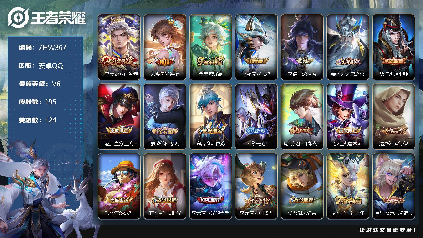 [12380875]【特价急出/详情看图】:安卓Q-V6-至尊星耀V段位-124英雄-195皮肤-5传说-53史诗 【英雄全皮】:蒙恬全皮,司空震全皮,影全皮 【传说皮肤】:司空震愿照山河定,云缨幻光神枪,桑启鸣野蒿,马超无双飞将,李信一念神魔 【限定皮肤】:姜子牙天穹之誓,狄仁杰阴阳师,赵云皇家上将,嬴政优雅恋人,扁鹊奇幻香踪,元歌无心,马可波罗山海玄木吟,狄仁杰魔术师,达摩沙漠行僧,项羽海滩派对,王昭君午后时光,李元芳匿光侦查者,李元芳云中旅人,杨戬潮玩骑兵,鬼谷子五谷丰年,百里玄策原初追逐者,梦奇顽趣,沈梦溪大漠名商,裴擒虎擒涛扼浪,狂铁电玩高手,嫦娥暖冬兔眠,鲁班大师探海日志,桑启海盐诗旅,暃星界游侠,艾琳流音漫舞,司空震地狱燃心,阿古朵江河有灵,张良古海寻踪,蒙犽百解令,蒙恬荣光圣徽,高渐离燃音魔法,妲己灵卜魔法,鬼谷子天穹祈灯,伽罗琥珀纪元,刘邦剑破天穹,关羽决胜骁骑,镜青焰无极,项羽苍威无极,刘备异域游侠,周瑜熔金海岸 【年限皮肤】:马可波罗山海玄木吟 【赛季限定】:达摩沙漠行僧,张良古海寻踪,李元芳云中旅人,百里玄策原初追逐者,梦奇顽趣,沈梦溪大漠名商,裴擒虎擒涛扼浪,鲁班大师探海日志,桑启海盐诗旅,鬼谷子天穹祈灯,蒙恬荣光圣徽,刘邦剑破天穹,姜子牙天穹之誓 【战令限定】:扁鹊奇幻香踪,王昭君午后时光,艾琳流音漫舞,杨戬潮玩骑兵,狂铁电玩高手,嫦娥暖冬兔眠,司空震地狱燃心,暃星界游侠,高渐离燃音魔法,妲己灵卜魔法,镜青焰无极,项羽苍威无极 【史诗皮肤】:赵云皇家上将,貂蝉圣诞恋歌,甄姬冰雪圆舞曲,狄仁杰魔术师,廉颇地狱岩魂,宫本武藏鬼剑武藏,孙尚香水果甜心,嬴政优雅恋人,嬴政暗夜贵公子,嬴政摇滚巨星,墨子龙骑士,墨子金属风暴,吕布圣诞狂欢,刘禅绅士熊喵,曹操幽灵船长,李白千年之狐,吕布末日机甲,夏侯惇乘风破浪,小乔缤纷独角兽,兰陵王暗隐猎兽者,亚瑟心灵战警,铠曙光守护者,李元芳逐浪之夏,程咬金功夫厨神,狄仁杰鹰眼统帅,娜可露露晚萤,百里玄策原初追逐者,司马懿暗渊魔法,夏洛特永昼,狂铁电玩高手,鬼谷子五谷丰年,元歌无心,梦奇顽趣,暃星界游侠,马可波罗山海玄木吟,镜玫瑰异探,扁鹊奇幻香踪,刘禅电玩爆裂旋风,李元芳匿光侦查者,司空震地狱燃心,阿古朵江河有灵,蒙犽百解令,妲己灵卜魔法,高渐离燃音魔法,蒙恬荣光圣徽,伽罗琥珀纪元,镜青焰无极,关羽决胜骁骑,孙膑茶境仙,白起苍鳞隐